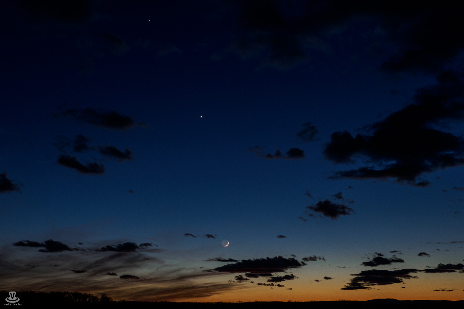 Május 18-án este 21:45-kor a hat százalékosra fogyó holdsarló, a Vénusz és a Jupiter együttállása lesz megfigyelhető. A holdsarló ekkor 10 fokkal a látóhatár felett látszik majd, amelytől jobbra a halványabb Elnath csillag, balra pedig a fényes, csillagszerű Vénusz lesz látható. A Jupiter a Holdtól jóval magasabban, balra felfelé látszik majd.