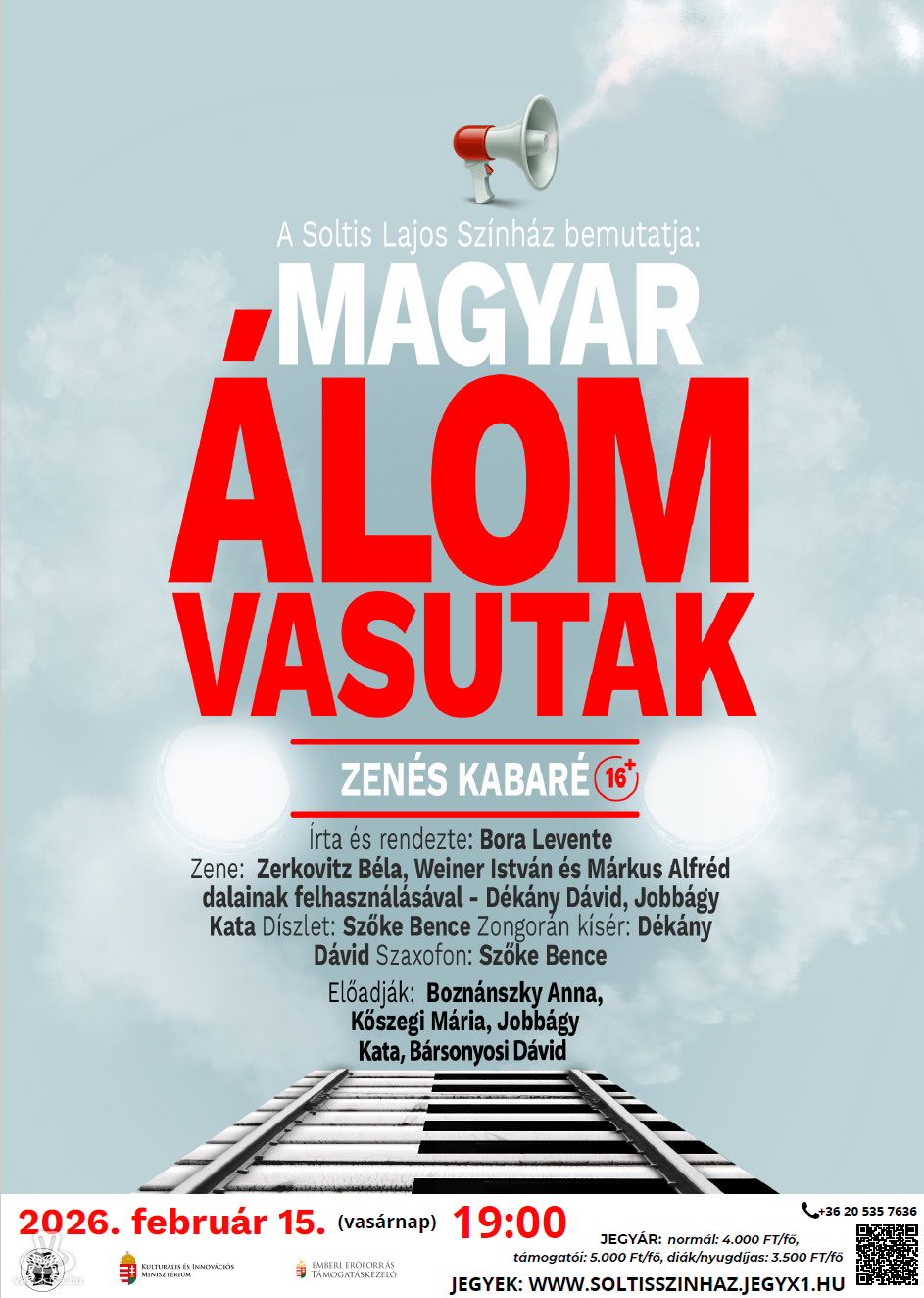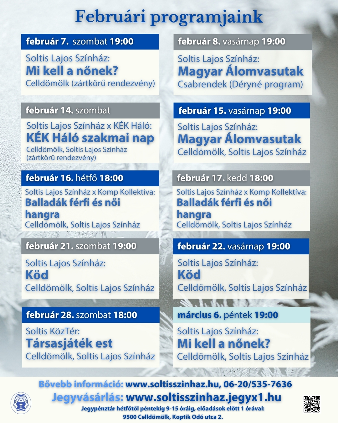 Magyar Álomvasutak, Mi kell a nőnek, Köd, Balladák férfi és női hangra előadások, valamint Társasjáték est a Soltis Lajos Színház februári programjában.