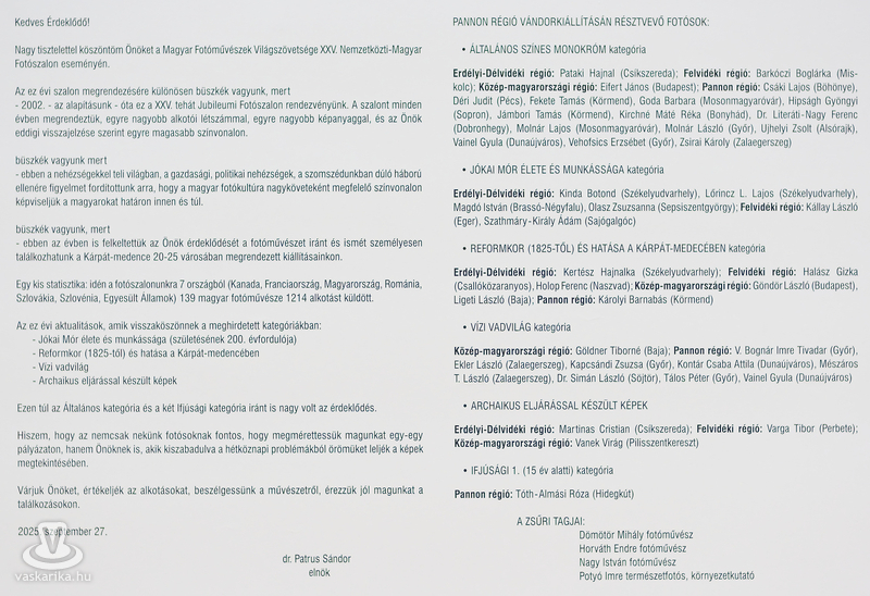 A Magyar Fotóművészek Világszövetsége 25. alkalommal hirdette meg pályázatát, amelyre számos kiemelkedő alkotás érkezett. A független zsűri több kategóriából válogatva közel 50 fotót mutat be egy különleges tárlat részeként, köztük három körmendi fotográfusét is. A kiállításmegnyitóra január 28-án került sor az AGORA Galériában, a színvonalas képanyagot Fekete Tamás, a MFVSZ dunántúli alelnöke ajánlotta az érdeklődők figyelmébe.