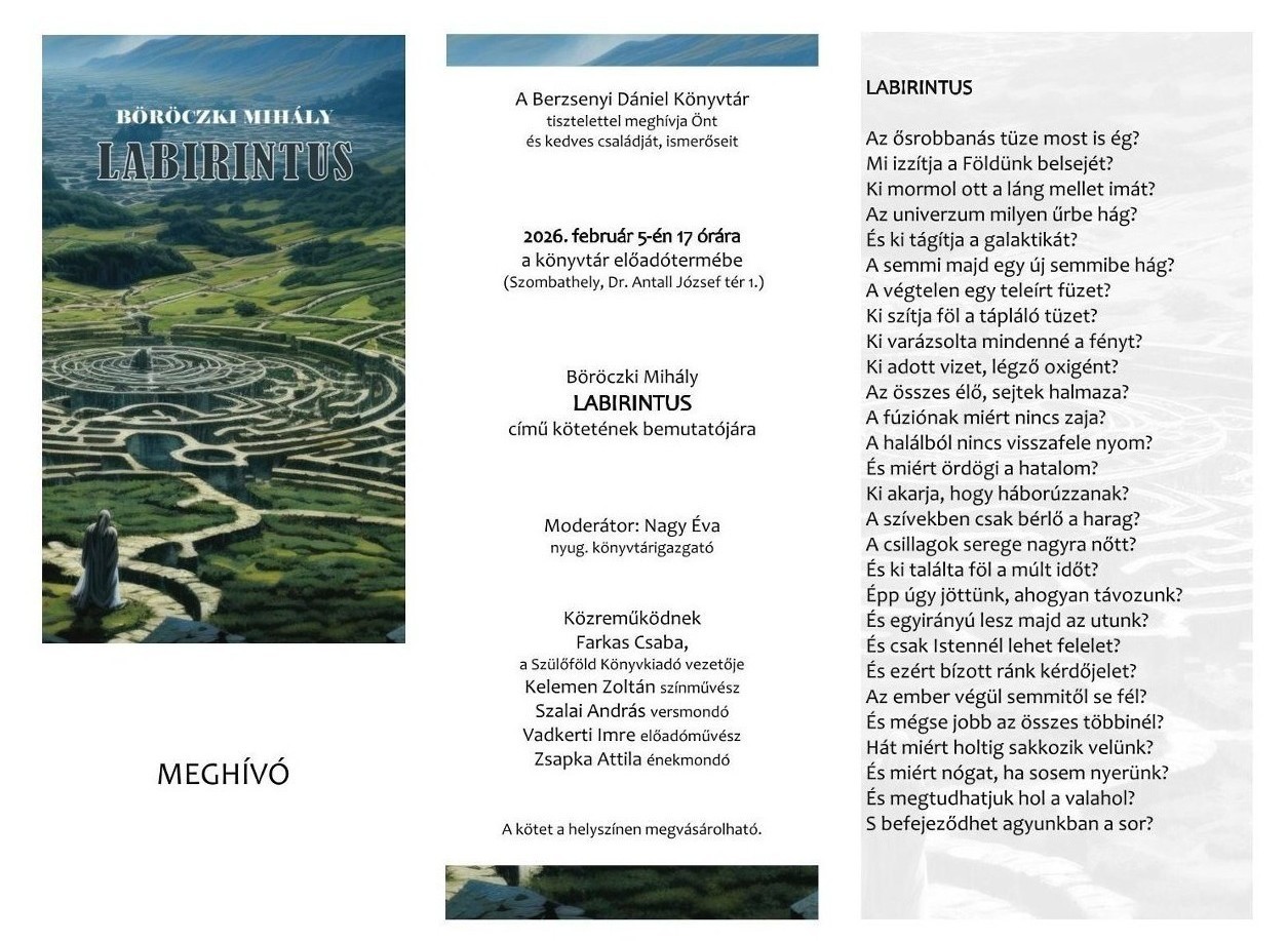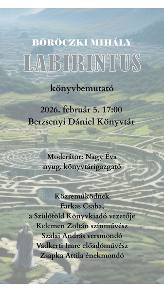 Február 5-én, csütörtökön Böröczki Mihály: Labirintus című könyvének bemutatójára várják az érdeklődőket a Berzsenyi Dániel Könyvtárba.