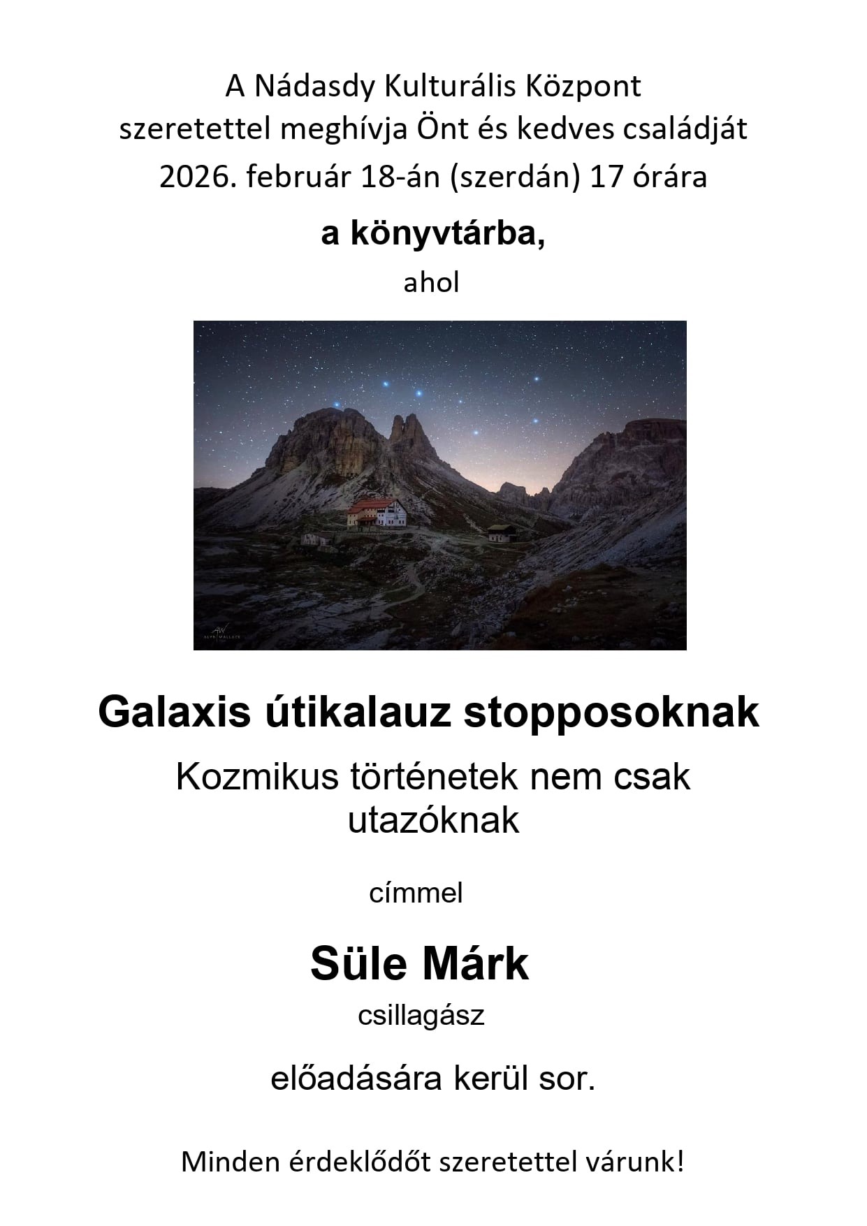 Február 18-án Galaxis útikalauz stopposoknak - Kozmikus történetek nem csak utazóknak címmel Süle Márk csillagász vezeti be az érdeklődőket az égbolt rejtelmeibe, bemutatva e csodálatos tudomány emberi oldalát.