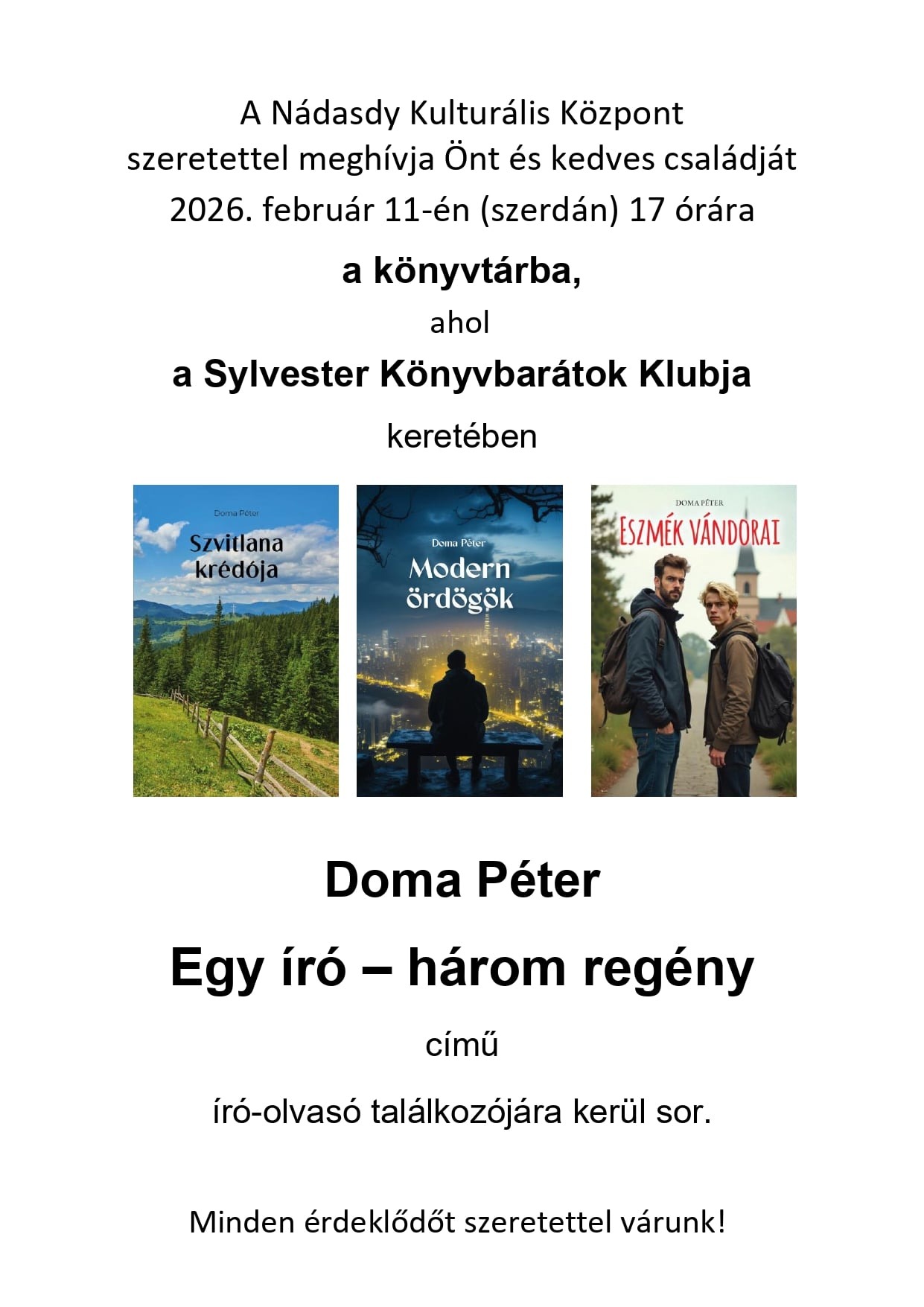 Február 11-én a Sylvester Könyvbarátok Klubjában Doma Péter lesz a vendég. Az író nemcsak eddig megjelent három regényének világába kalauzolja el a közönséget, hanem személyes életfilozófiájáról és sajátos világlátásáról is megosztja gondolatait.