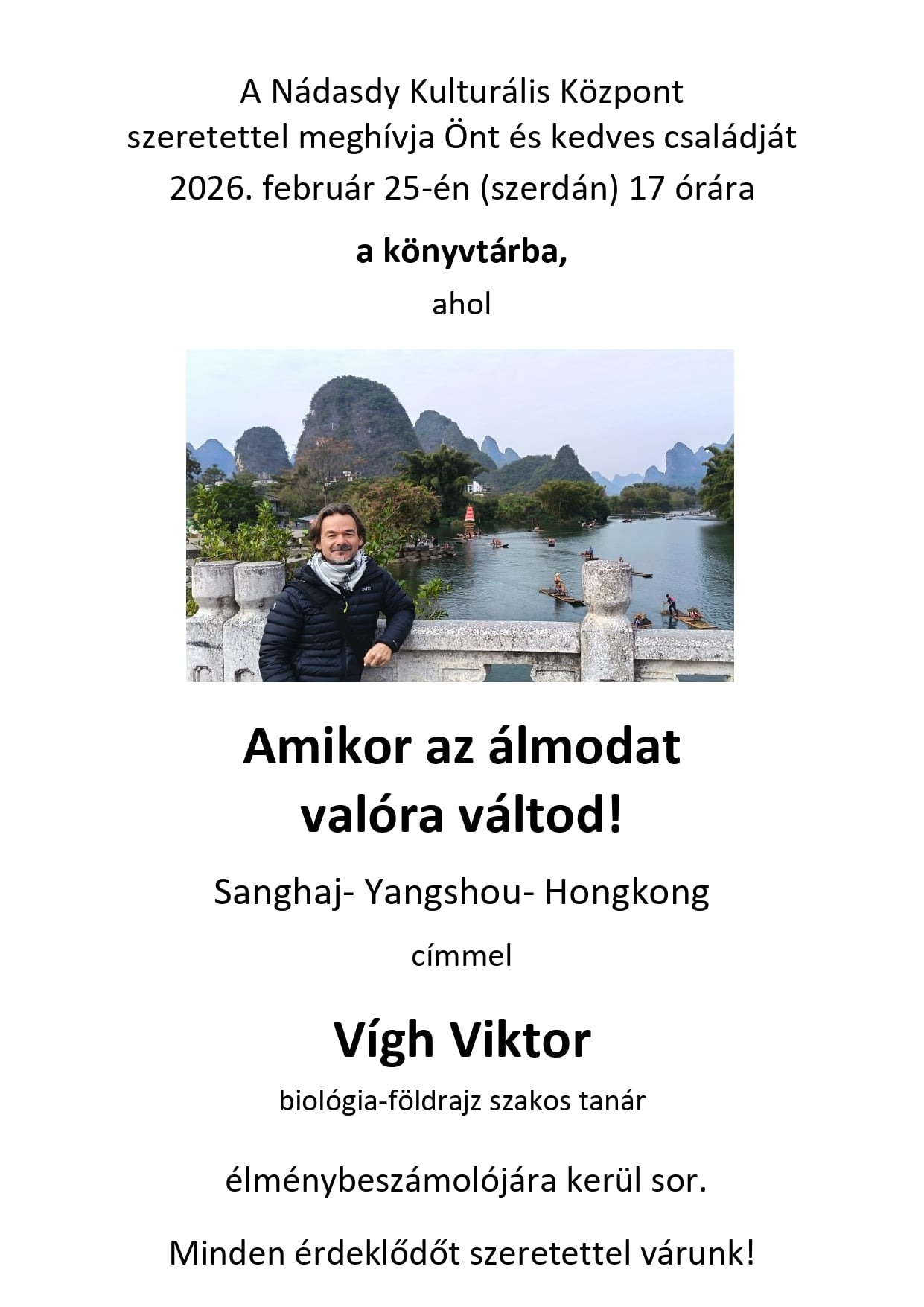 Február 25-én Amikor az álmodat valóra váltod! - Sanghaj- Yangshou- Hongkong címmel Vigh Viktor biológia- földrajz szakos tanár élménybeszámolóját hallhatják az érdeklődők.