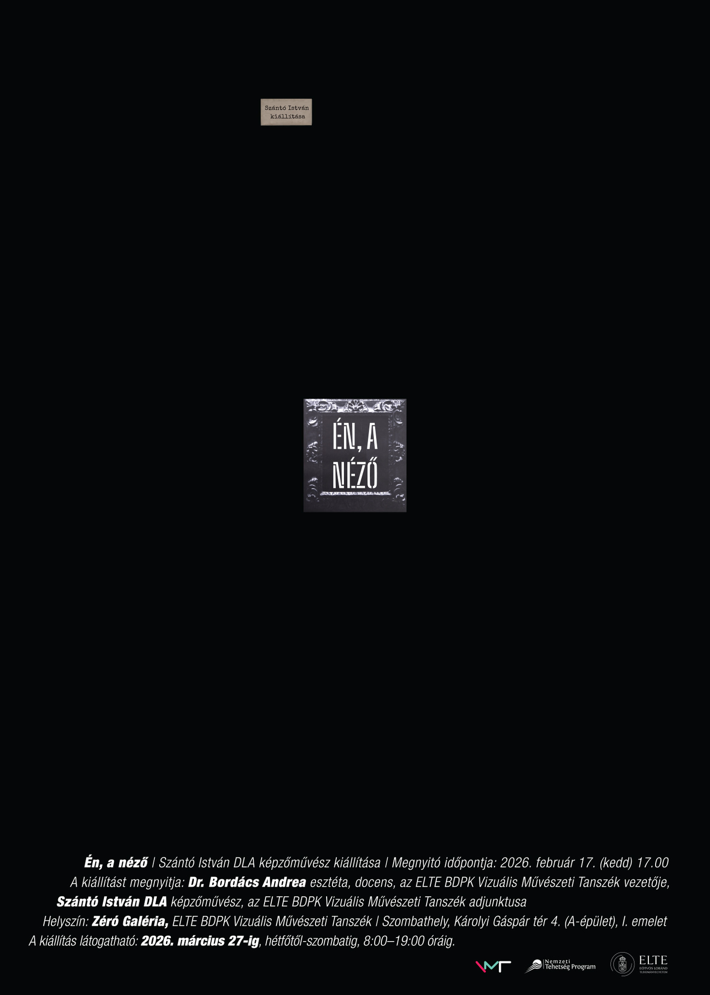 Az ELTE BDPK Vizuális Művészeti Tanszékének Zéró Galériájában nyílik „Én, a néző" című önálló fotókiállítása Szántó István képzőművésznek, amelynek központi témája a műtárgy, a gyűjtemény és a néző hármas viszonya, különös tekintettel a néző szerepére.