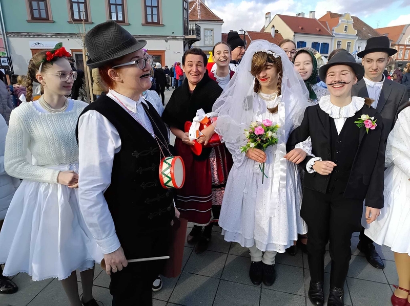 10 óra előtt aztán megérkeznek az óvodások, és iskolások is a Fő térre, ahol rögtönzött utcabál keretében mutatják be jelmezeiket. Idén 10.00-kor a Réparetekmogyoró Társulat interaktív gyerekműsora szórakoztatja a kicsiket. Délidőben is javasoljuk valamely „átminősült" egységben az étkezést, majd 15 órakor indul a felvonulás. A menet végigmasírozik a belvároson, és visszatérve a Fő térre a Hajnalcsillag Néptáncegyüttes tagjai mutatják be „bolond esküvőjüket". Ezután utcabál kezdődik a Kvarc zenekar közreműködésével. 17 órakor lesz az eredményhirdetése a jelmezversenynek.