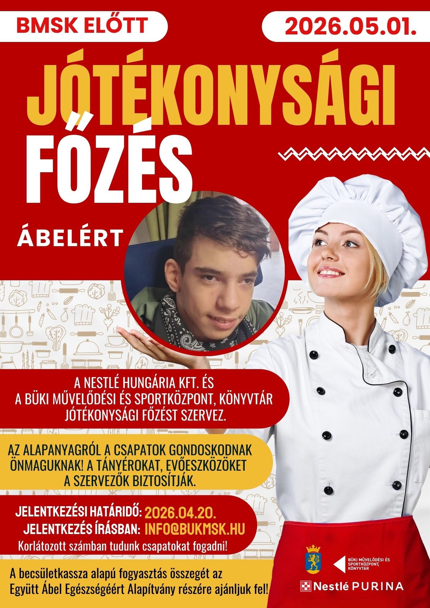 Május 1-jén egy különleges programmal készülünk: jótékonysági főzést szervezünk Ábel támogatására. Ehhez keresünk lelkes csapatokat, akik szívesen csatlakoznának a kezdeményezéshez. Ha van egy baráti társaságotok, munkahelyi csapatotok vagy közösségetek, amelyik szeret főzni és szívesen részt venne egy jó hangulatú, közösségi eseményen egy nemes ügyért, akkor nagyon örülnénk a jelentkezéseteknek.
