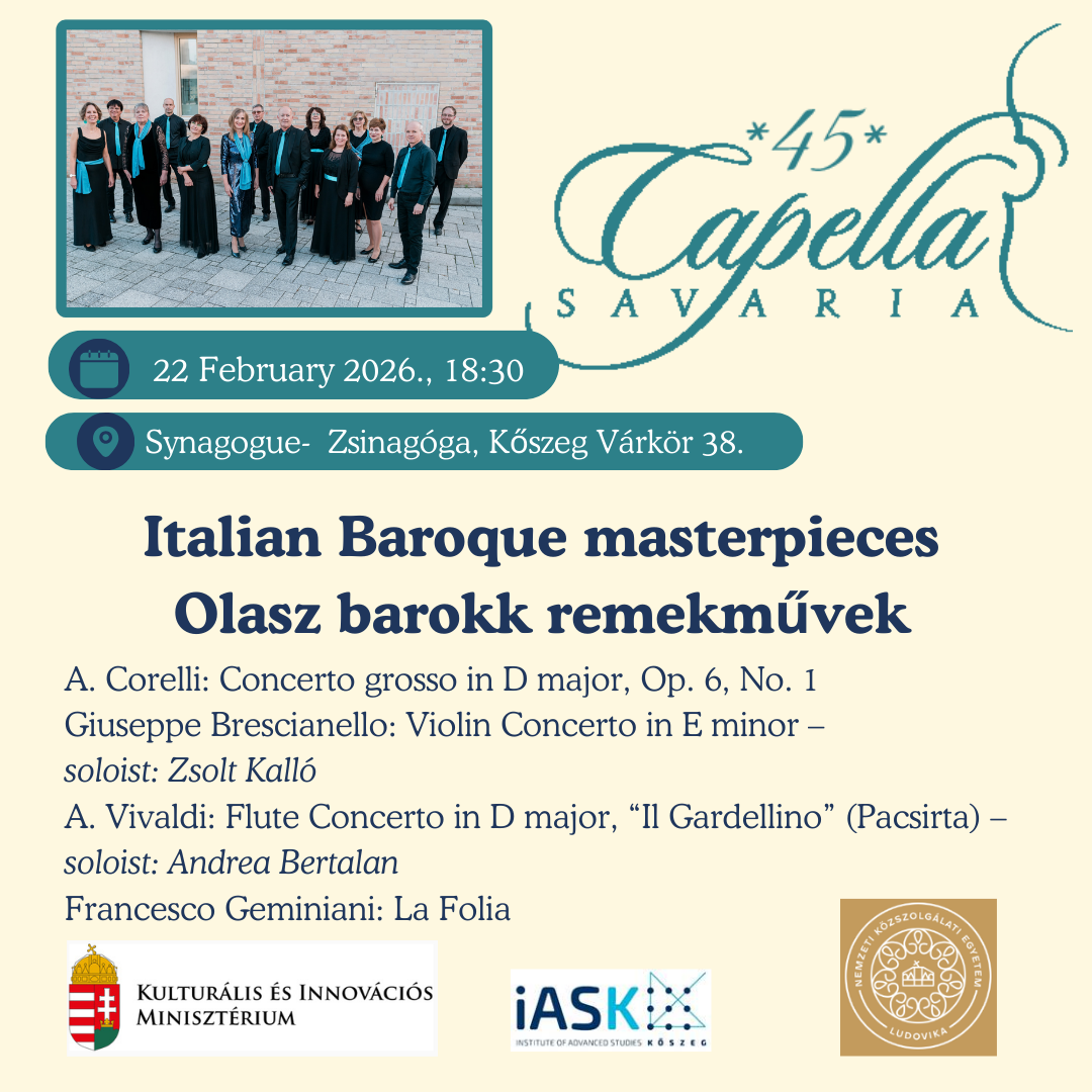 Február 22-én, vasárnap 18:30-kor kezdődő 'Olasz barokk mesterművek' című koncertjére várja az érdeklődőket a Capella Savaria.