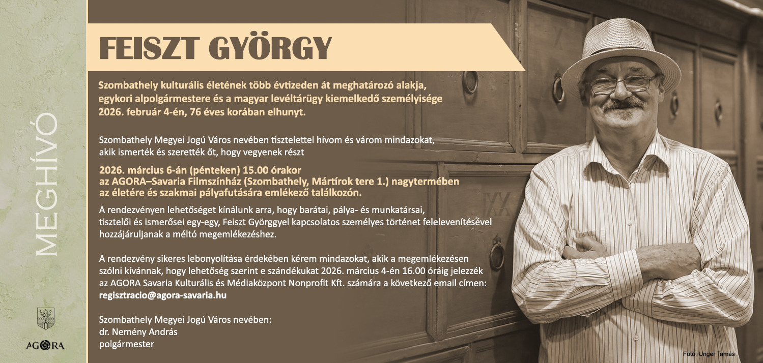 Feiszt György Szombathely kulturális életének több évtizeden át meghatározó alakja, egykori alpolgármestere és a magyar levéltárügy kiemelkedő személyisége 2026. február 4-én, 76 éves korában elhunyt. Szombathely MJV március 6-án 15.00 órakor életére és szakmai pályafutására emlékező találkozót szervez az AGORA–Savaria Filmszínház (Szombathely, Mártirok tere 1.) nagytermében.