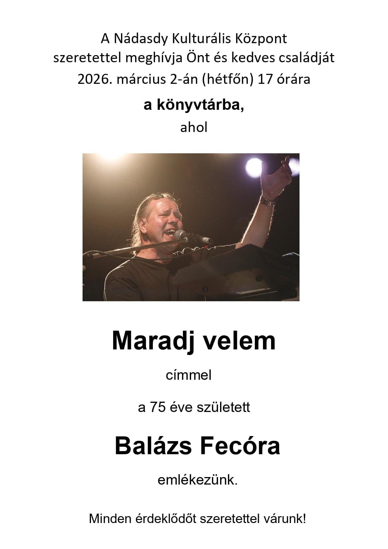 Március 2-án indul új programsorozatunk: Zenehétfő címmel. A nyitórendezvényen a 75 éve született Balázs Fecóra emlékezünk, természetesen sok-sok zenével.