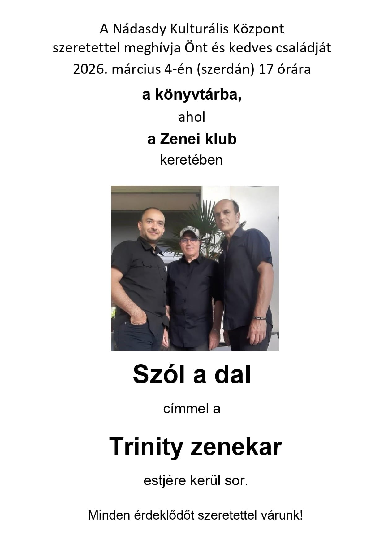 Március 4-én, a Zenei klub keretében az igényes popzenét játszó Trinity zenekar szórakoztatja a közönséget.