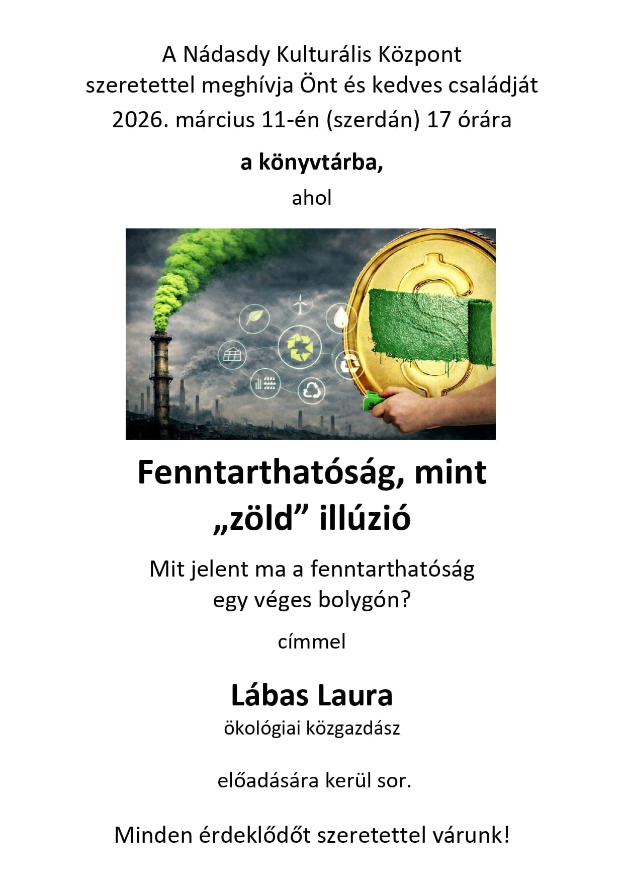 Március 11-én Fenntarthatóság, mint „zöld" illúzió - Mit jelent ma a fenntarthatóság egy véges bolygón? címmel Lábas Laura ökológiai közgazdász előadását hallgathatják az érdeklődők.