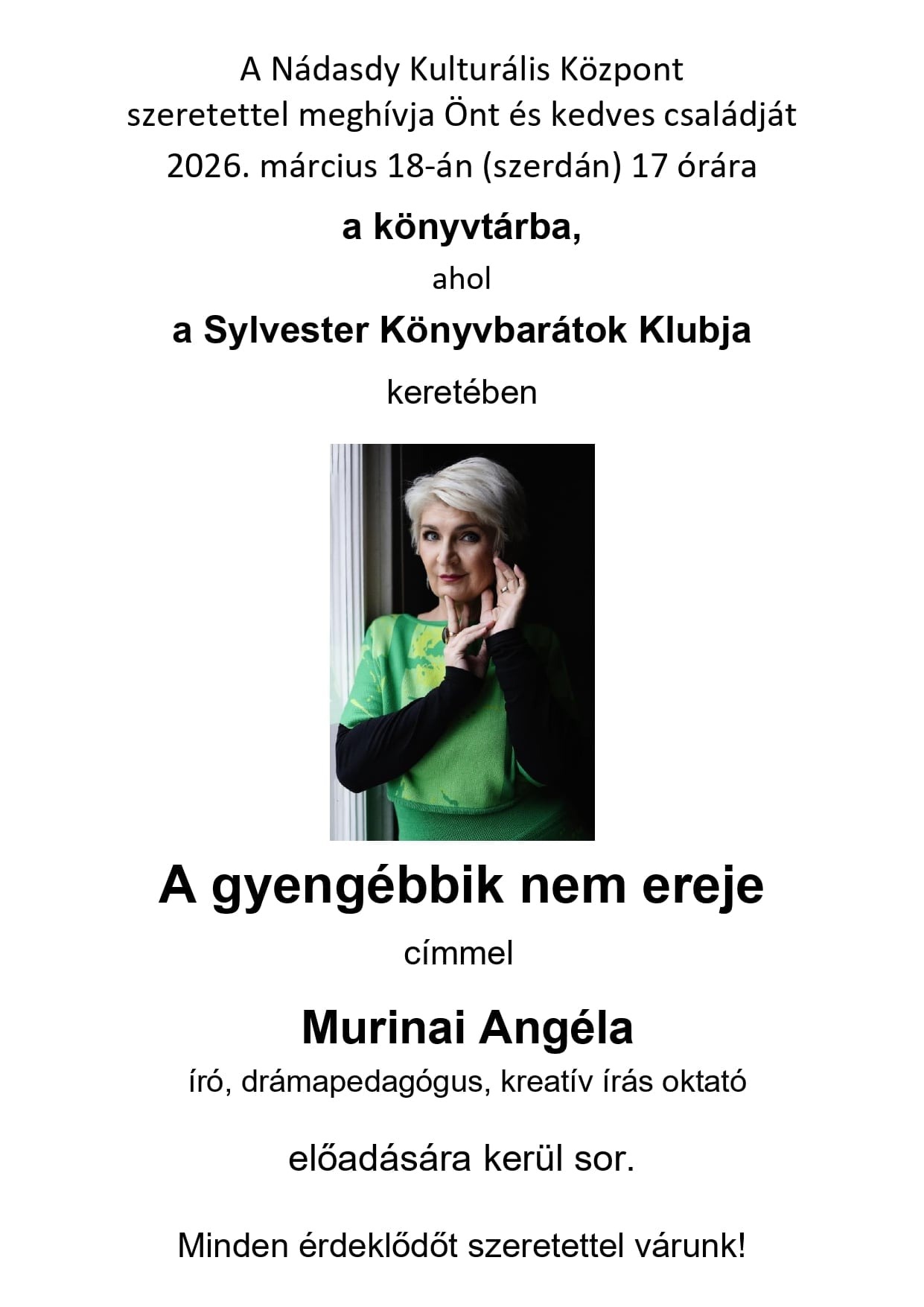 Március 18-án Sylvester Könyvbarátok Klubjában Muriani Angéla író, drámapedagógus, publicista lesz a vendégünk.