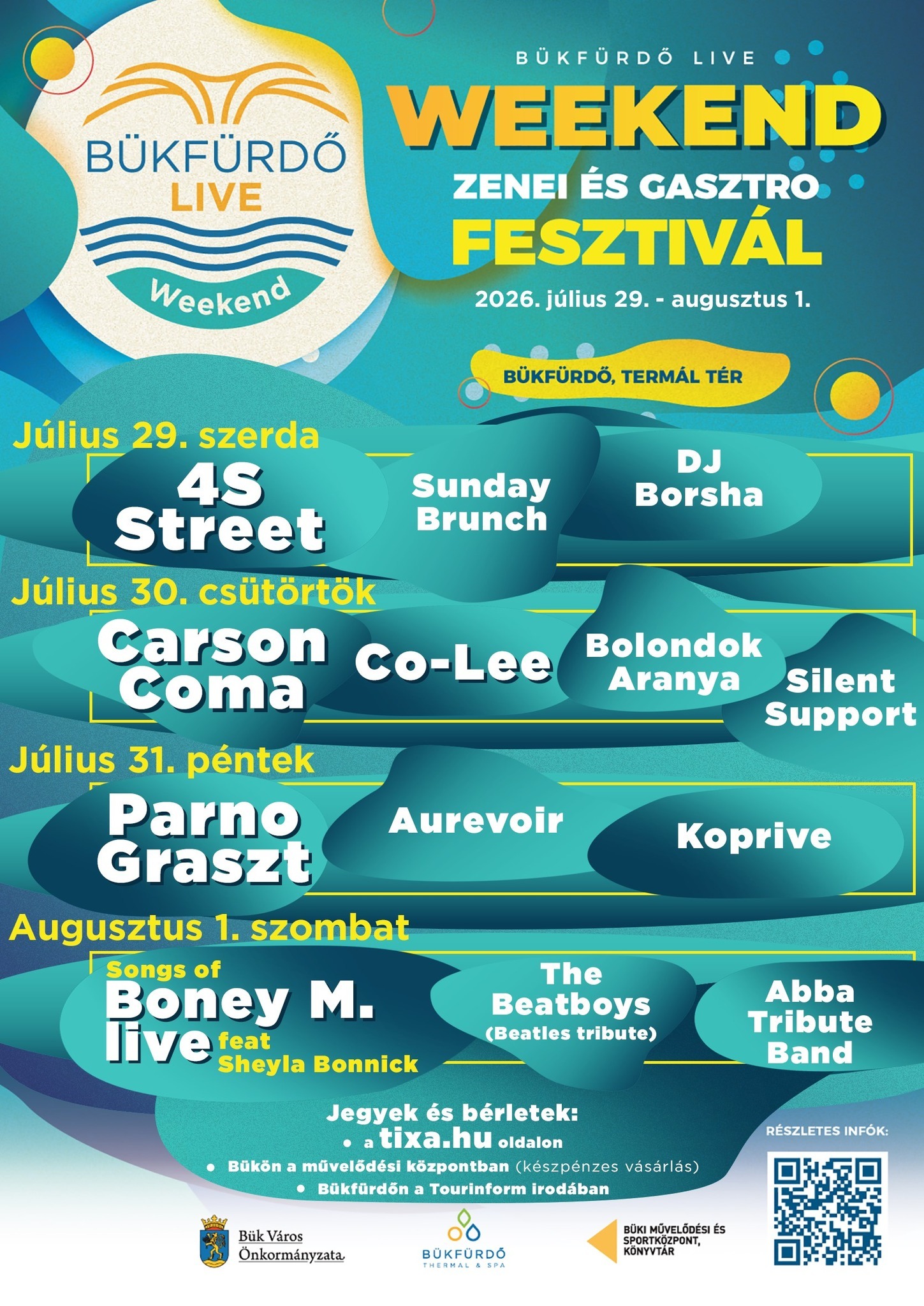 Idén a Bükfürdő Live Weekend zenei programon ott leszünk szervezőként, ami négynapos lesz. A 0. napon a Pannon Cigányzenekart ünnepeljük, aki erős szálakkal kötődik Bükhöz és idén jubilál: 20 éves lesz. Népszerű, sztárvendégekkel érkeznek egy nagykoncertre kedden. Ez a nap ingyenes lesz. A szerdai naptól indul majd a fesztivál, ennek napi főfellépője a 4S Street zenekar lesz. Csütörtökön a Parno Graszt és az Aurevoir lép színpadra egy világzenés nap részeként, míg a pénteki napnak a Carson Coma és Co Lee lesz a sztárfellépője, ami inkább a fiataloknak szól. A szombati napon három tribute zenekar lép fel: egy BoneyM tribute Sheila Bonick-kal, aki a BoneyM egy bizonyos időszakában a zenekarban énekelt, így várhatóan klasszikus BoneyM-showt kapunk. Ezt megelőzően Magyarország egyik legjobb ABBA-zenekara és a legjobb Beatles tribute zenekara játszik, elmondhatjuk tehát, hogy egy színpadon lesz a Beatles, az ABBA és a BoneyM egy fergeteges nosztalgianap részeként. A Bükfürdő Live Weekend idén megújult jegyárakkal, bérletkombinációkkal indul, február 2-tól online módon lehet már jegyeket venni, az elmúlt évekhez viszonyítva kedvezőbb árakon.