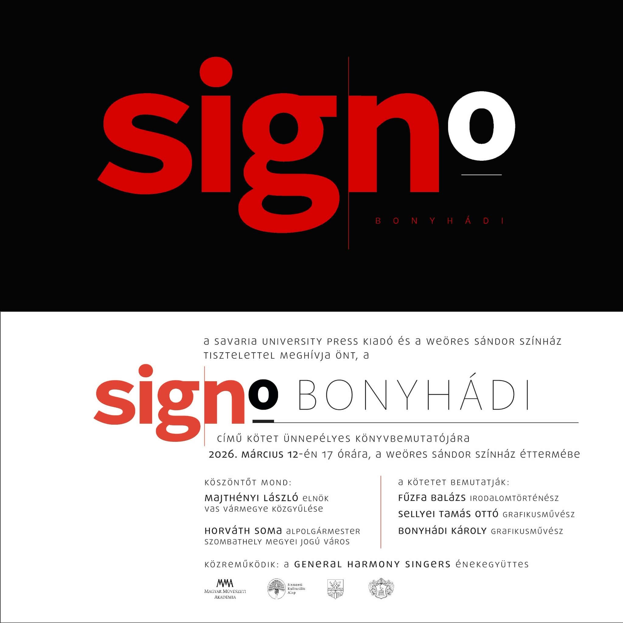 Signo címmel a Savaria University Press kiadó gondozásában jelent meg az a kötet, mely Bonyhádi Károly grafikus életművével ismerteti meg az olvasót. Az ünnepélyes könyvbemutatóra 2026. március 12-én 17.00 órai kezdettel kerül sor a Weöres Sándor Színház éttermében.