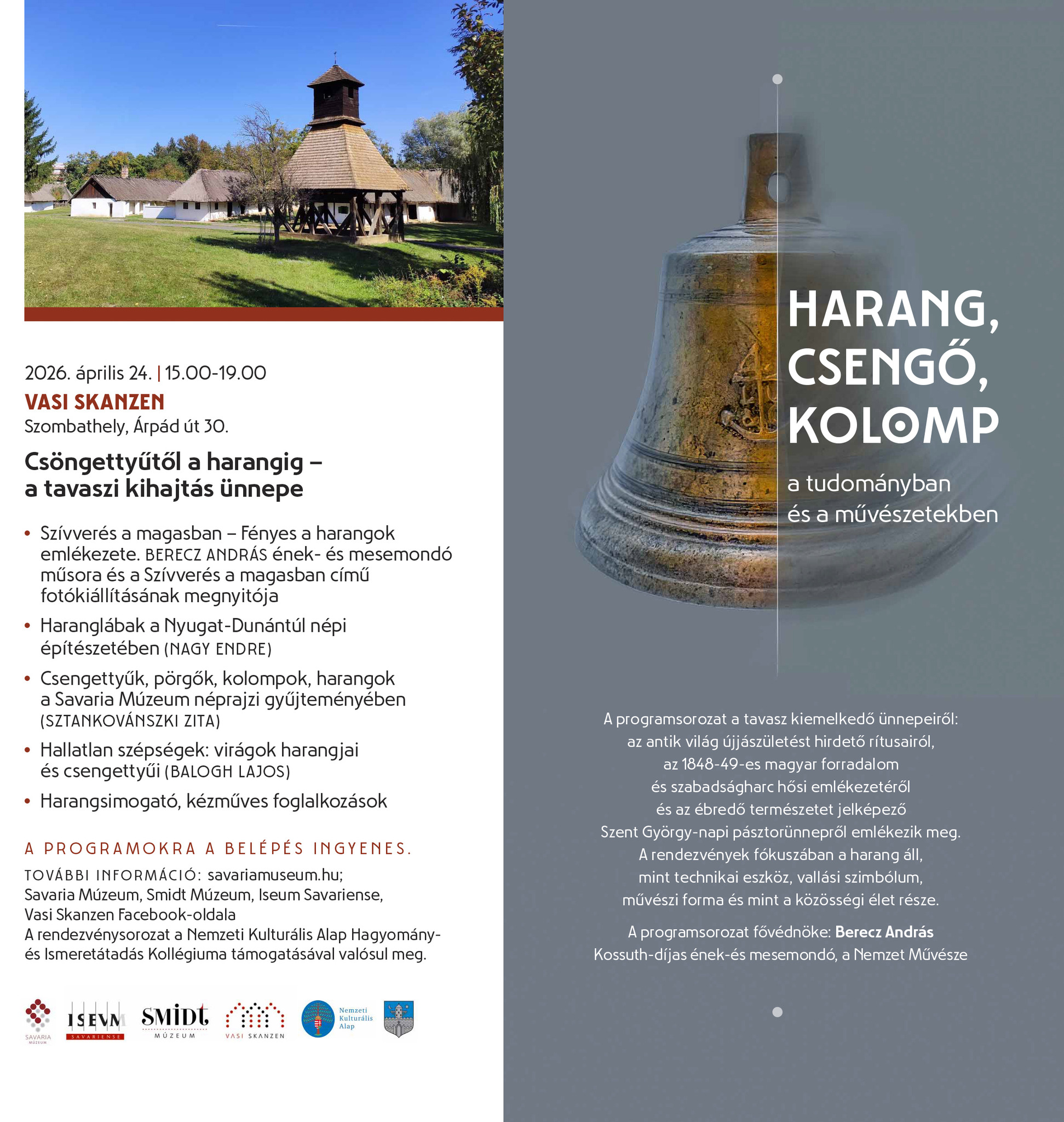 Április 16-án (csütörtökön) 14 és 18 óra között rendezik meg az Iseumban az Össz-hang” – tudomány, társadalom, kultúra, vallás és művészet metszéspontjai című konferenciát, április 24-én pedig a Vasi Skanzenben kerül sor a Csöngettyűtől a harangig - a tavaszi kihajtás ünnepe című programra.