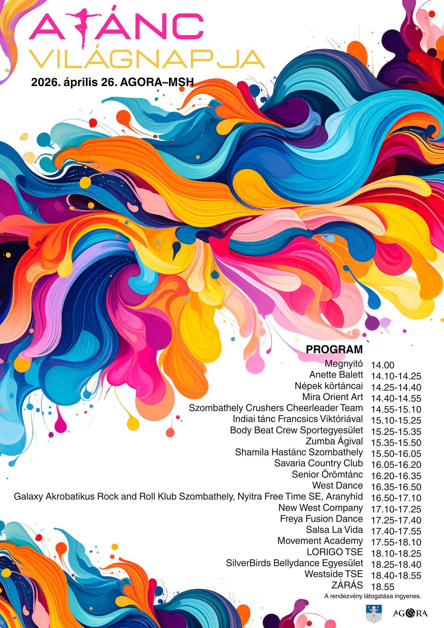 Szombathely, a "Tánc Fővárosa", 2026-ban is színes bemutatók sorával ünnepli a Tánc Világnapját. A város táncegyesületei számos stílust képviselnek, mely látványos táncokat, nagyszerű hangulatot garantál. Az AGORA–Művelődési és Sportház parkettjén salsát, versenytáncot, country-t, breaktáncot, hip-hopot, hastáncot, körtáncot, zumbát, valamint rock and roll műfajt is láthat április 26-án a közönség. A belépés ingyenes!