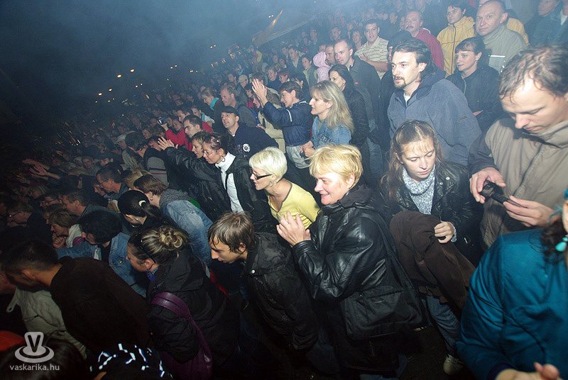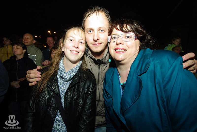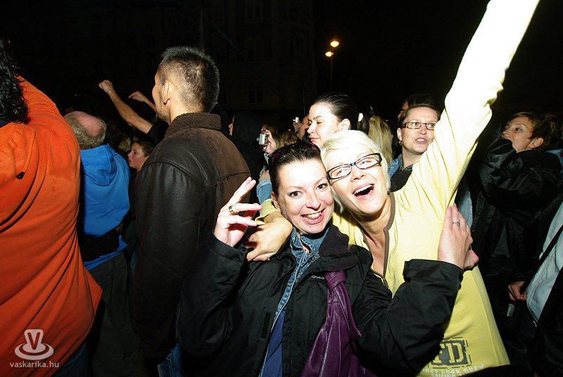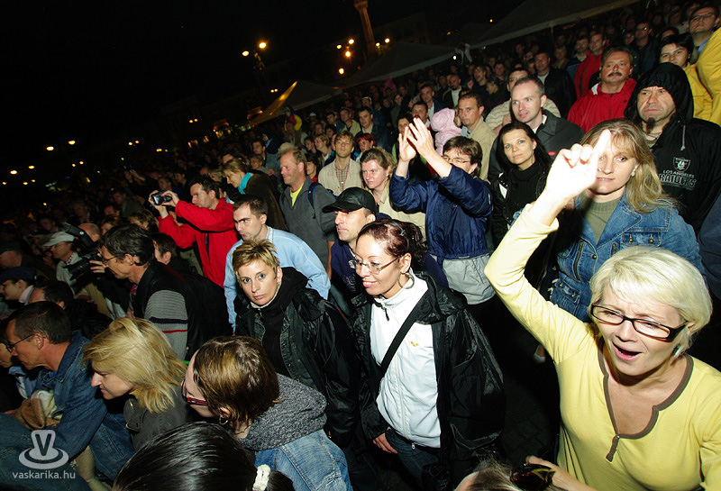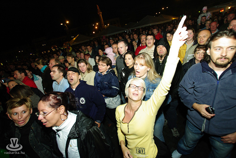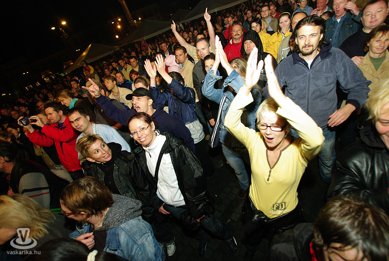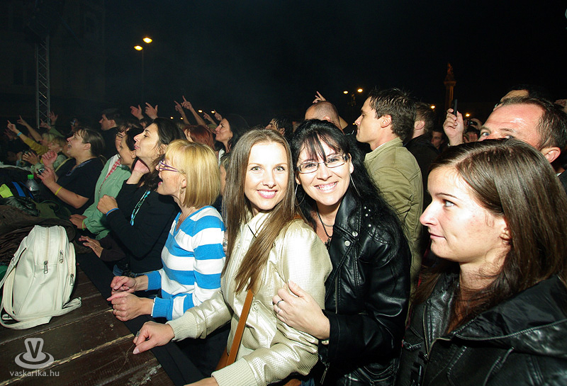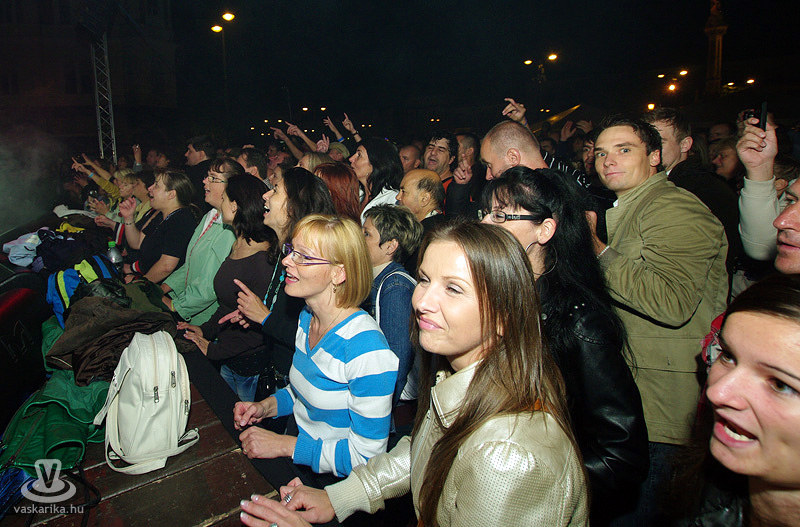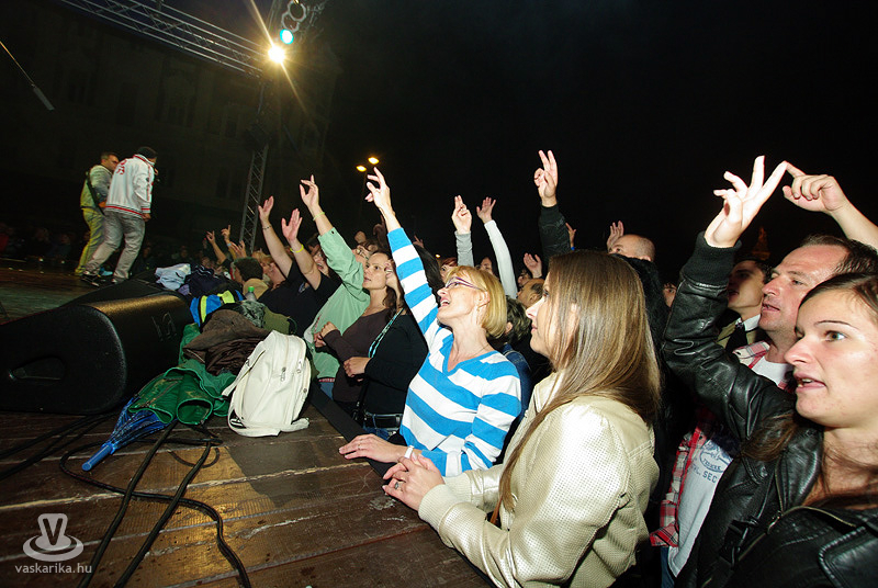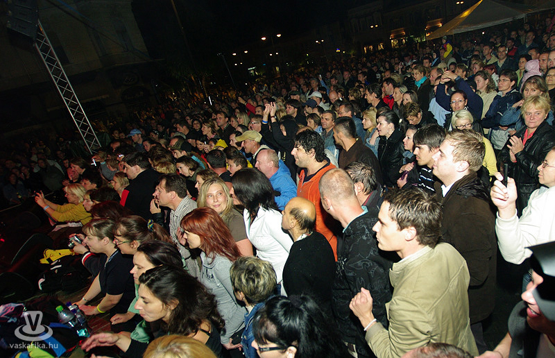 Az Első Emelet esetében az újjászületés először csak egy 15. évfordulót ünneplő koncertet jelentett, majd jelentős állomásként megemlíthető egy 25. évfordulós Syma csarnokos buli. Ma pedig ott tartunk, hogy az eredeti, legendás tagok közül négy részvételével az együttes él és virul, köszöni jól van és jövőképpel rendelkezik. A koncertidőpontokkal teli előjegyzési naptáruk pedig azt sejteti, hogy az egyre hiányosabb hajkoronát viselő srácok megtalálták a számításukat pályájuk retro korszakában. És hogy mennyire érdemes megállítani azt a bizonyos liftet egy első emeleten tartott koncerten? Élő példa volt rá a szombat esti főtéri buli, hogy bizony, időjárás-függetlenül is érdemes, mert a zenekart 25 év elteltével is ezrek ünnepelték az őszvégi gúnyát öltő időben.