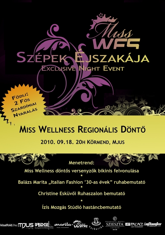 Szeptember 18-án 20 órakor kerül megrendezésre a Miss Wellness regionális szépségverseny döntője a körmendi MJUS Wellness és Spa resort diszkójában. A 15 döntős versenyző mellett Balázs Marita '30-as évekbeli olasz divatbemutatóját, illetve a soproni Christine Esküvői ruhaszalon bemutatóját is megtekinthetik a nézők. Vas megyét több, mint 10 lány képviseli!