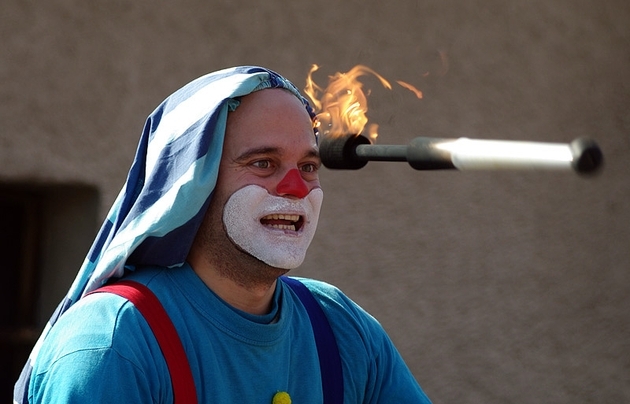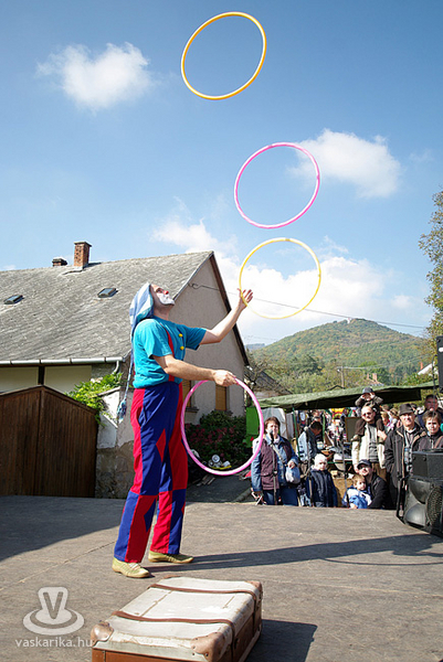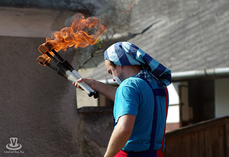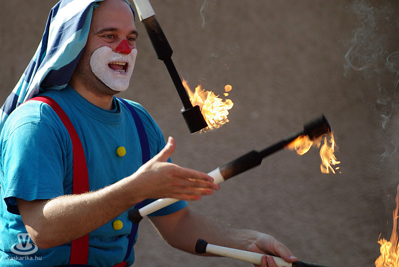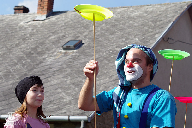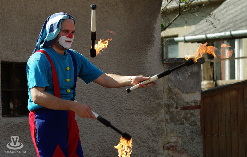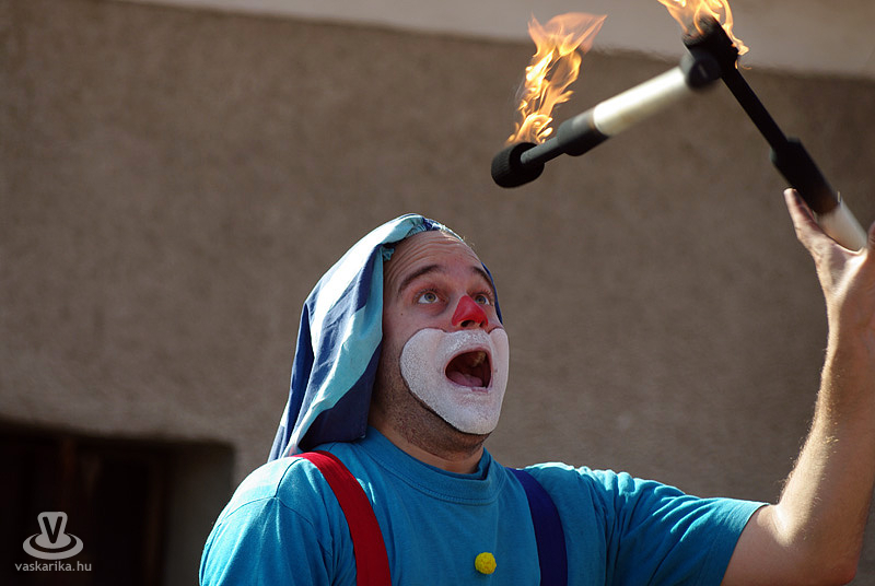A déli órákban az Utcaszínpadon Zsongi bohóc zseniális műsorába futottunk bele, ami nemcsak a kisklambóknak, hanem a felnőtteknek is ugyanoly látványos és izgalmas volt, főként a tüzes fáklyákkal való zsonglőrködés. Zsongi bohóc neve ily módon beszélő név lett - mindennemű túlzás nélkül.