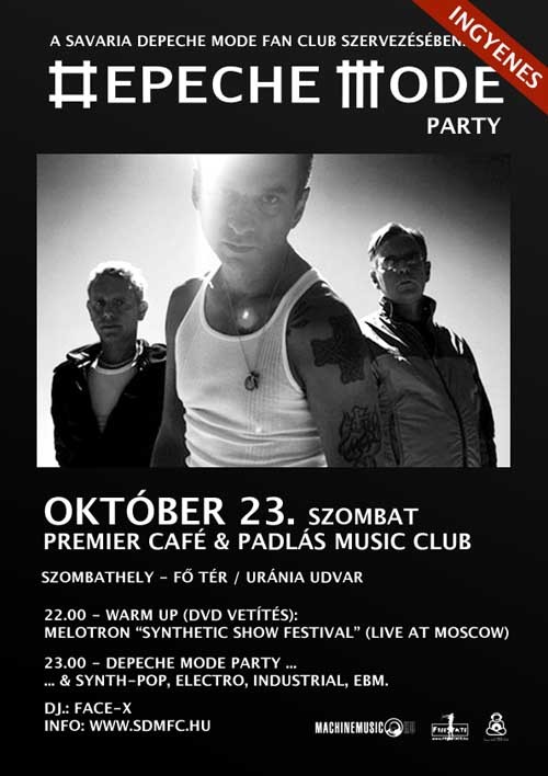 A Savaria Depeche Mode Fan Club által szervezett aktuális DEPECHE MODE PARTY szombaton, október 23-án kerül megrendezésre a szombathelyi PREMIER CAFÉ & PADLÁS MUSIC CLUB felső szintjén a "PADLÁS"-on. Ez alkalommal is ingyenes, hajnalig tartó buli várja a Depeche Mode rajongókat, és a műfaj kedvelőit.
