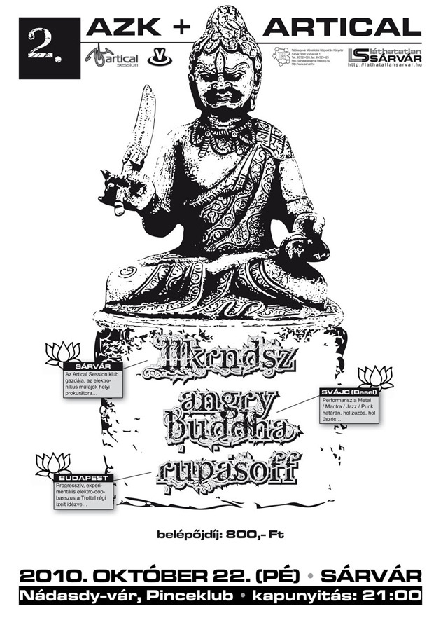 Az évad egyik legizgalmasabbnak ígérkező AZK+Artical estéjére számíthatunk október 22-én a Pinceklubban. A kísérleti, progresszív műfajok Don Quijotéje, a Trottelből ismert Rupaszov Tamás hozza Rupasoff nevű duóformációjában a Trottel múltjának elektro-dob-basszusra hangszerelt változatát, ami önmagában is páratlan experimentális élményt ígér. De nem lesznek egyedül, Baselből (Svájc) kíséri őket az Angry Buddha, akik performanszuk során a metált, a mantrák világát, a jazzt, a punkot fogják vegyíteni. Mivel hibridműfajokról van szó, keményen csapásvonalba helyezkedik az este az Artical Session számára is, amit llkrndsz fog majd képviselni a pult mögött.