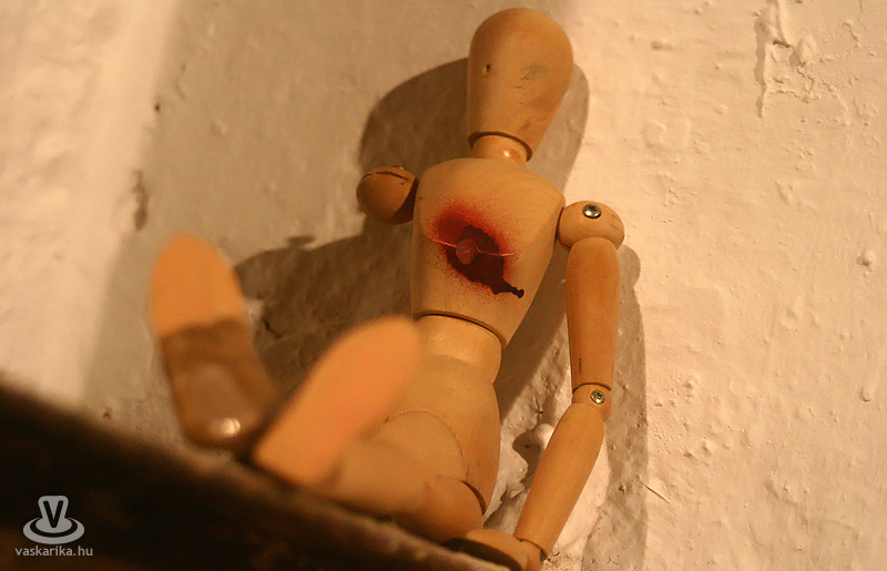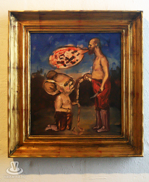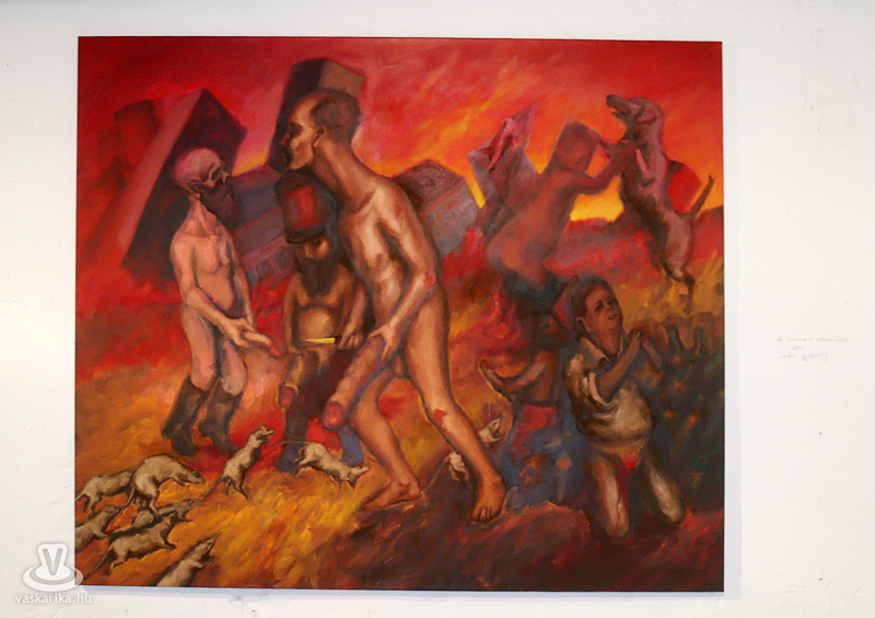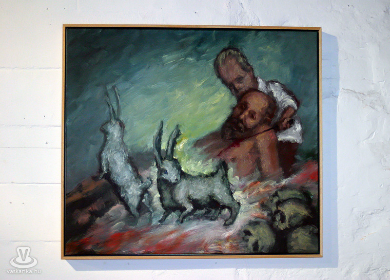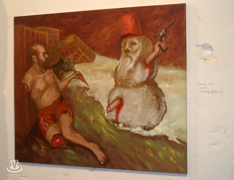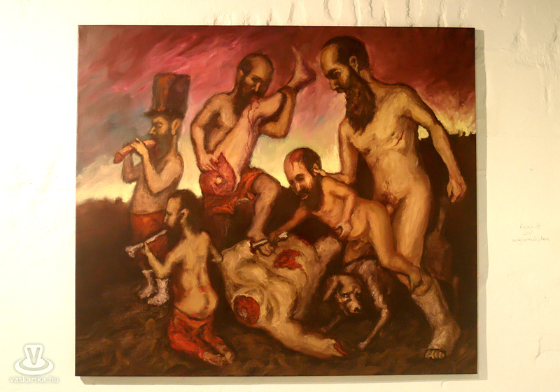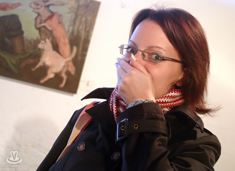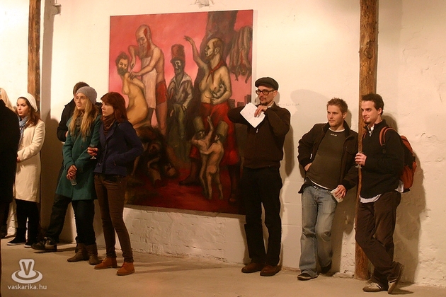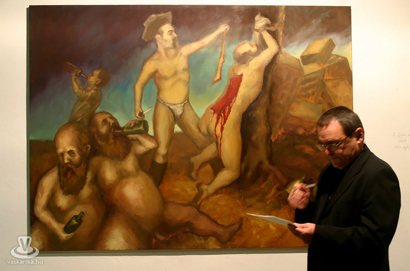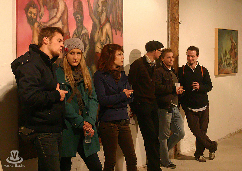 Az esti hétórás kezdésre szép számmal összegyűltünk ismét. Egy dolgot bánunk most, így utólag de nagyon, mégpedig azt, hogy nem stoppoltunk le egy félórára a lépcsővéghez, ahol az első képeket arcba kapták a gyanútlan látogatók. Komoly jellem- és szituációs szakdolgozatot lehetett volna összehozni belőle. Kiss Róka Csaba képein ugyanis a vér, a csonkítás, a perverziók és a férfi nemi szervek száma arányaiban minimum megegyezik a Rohonczi úton, meccsidőben a halisál/B-közép tagok számával. Mint azt P. Szabó Ernő művészettörténész, a Magyar Nemzet újságírója megnyitó beszédének elején kiemelte, ez a látványvilág csak a modern kor emberét riasztja meg, hisz még a középkor legvégén is hétvégi látványosság volt egy jó kis kerékbetörés, és hasonló kellemetes, össznépi ínyencségek. Fél füllel hallottuk még, hogy a hat órakor induló művészetis tárlatvezetésen az egyik ifjú hölgy szinte rosszul lett a képek láttán.