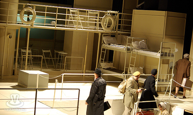 Az MMIK piros színházterme mellett erőteljesen hatott a monumentális, fehér színpadkép. Mintha magunk is a hajó utasai lettünk volna. Tisztaság, múltbéli események tisztázása, akár az esendőség leképeződése is lehetne. Nevezhetjük akár ennek is, vagy éppenséggel a kiúttalanságnak. Egy azonban bizonyos: dicséretet érdemel a precízen és alaposan megkonstruált díszlet, hiszen nem csak a színpadi mélységet, de a magasságot is tökéletesen alkalmazta. A szereplők három szint között mozogtak, érzékeltetve ezzel akár az események, történések súlyát. A fénytechnikával megoldott jelenetváltások a szemünk előtt zajlottak, a színészek egy része olykor a színpad egyik felében játszott, a másik fele várakozott, míg újra rá nem vetődtek a fények. Jellemző volt tehát a szinte folytonos jelenlét a színpadon.