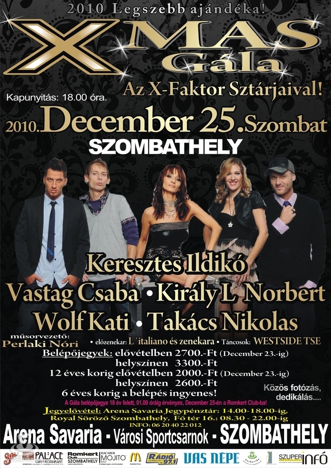December 25-én az Arena Savariában lépnek fel az X-Faktor Sztárjai - Wolf Kati, Takács Nikolas, Király L. Norbert és Vastag Csaba - valamint Keresztes Ildikó! A karácsonyi gálával kapcsolatban az alábbi kérdésre várjuk olvasóink megfejtését:
