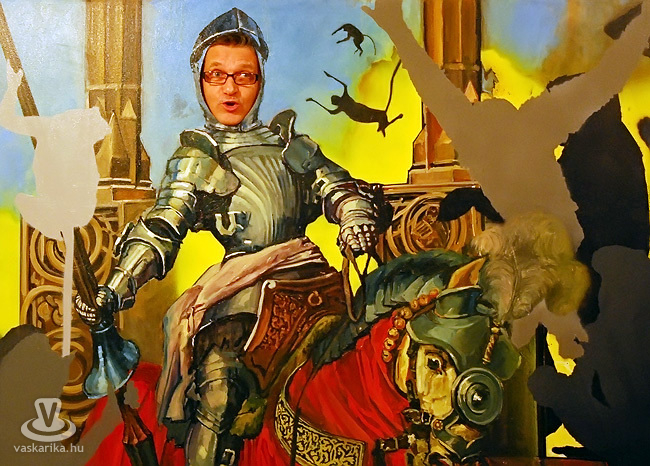 A központi figura mindenesetben egy talpig páncélos, arctalan lovag, pontosabban csak a külső fémburka. Egyedül vagyunk, és egyenpáncélt hordunk. Dölyfösen ülünk hízott sertésünk hátán, kezünkben lobog a keresztesek zászlaja, és furcsa félszerzetek vezetnek pórázon bennünk. Amennyiben a színhasználat komorabb lenne, valószínű megrettennénk a mondanivalótól, de mivel minden kép retinakényeztető kombinációkkal él, pozitív üzenete van az egésznek. Realista-optimizmus, vagy valami hasonló érzeteink vannak a nagytermi felhozatalt nézegetve. Aztán áttendálunk a kistermekbe, ahol a mézeskalács művek sorakoznak.