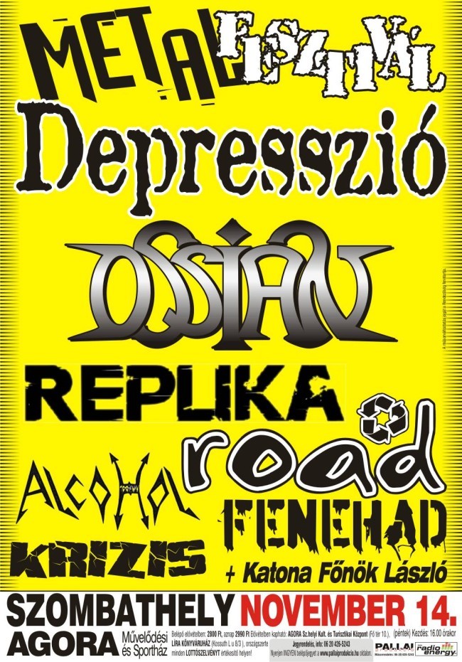 METÁL FESZTIVÁL - „Szombathelyi Rocknap" elnevezéssel a fémzene szerelmesei rázhatják sörényüket fél napon keresztül olyan bandákra, mint az OSSIAN, a DEPRESSZIÓ, a REPLIKA, a ROAD, a FENEHAD és Katona Főnök László valamint a KRÍZIS. A november 14-i esemény kapunyitása 16 órától kezdődik.