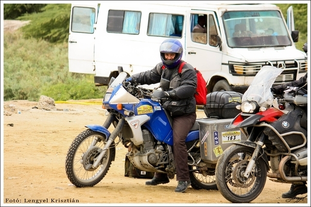 BG: Afrikában mindenkinél, de legfőképp a rendőröknél kell alkudozni. Ez úgy működik, hogy leint, azt mondja, gyorsan mentél, mert a bekötő úttól balra bent 500 m-re van egy iskola. Ebből a következő módon alakult ki a párbeszéd: „Too fast."- „How much?" (Azaz „Túl gyors." - „Mennyi?") Aztán addig alkudoztunk és nézegettük egymást, míg a fejenkénti 20 eurós büntetést lealkudtunk 5-re. Legtöbbször csak mondvacsinált indokok miatt állították le a versenyzőket. Az egyikünket azért büntették meg, mert állítólag hátul volt egy rögzítetlen csomagja, de a legjobb az volt, amikor egy másik srácot azért büntettek meg, mert nem indexelt az úton álló szamárnak. A határon szintén érdekes dolgok történtek, ha nem fizettünk, nem engedtek tovább. A hivatalos papírokat nem szabad kiadni a kezünkből, mert amint nála vannak az irataid, onnét őnála van a hatalom.