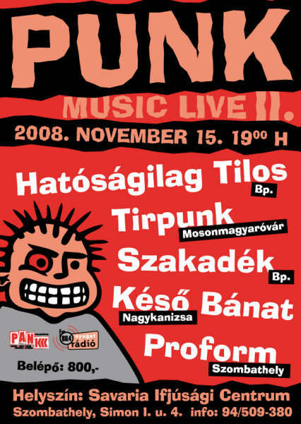 November 15-én, szombaton immár második alkalommal – először a SIC-ben – kerül megrendezésre a Punk Music Live névre keresztelt minifesztivál. Akik felnyomják az adrenalint: Hatóságilag Tilos, Szakadék, Tirpunk, Késő Bánat, Proform.
