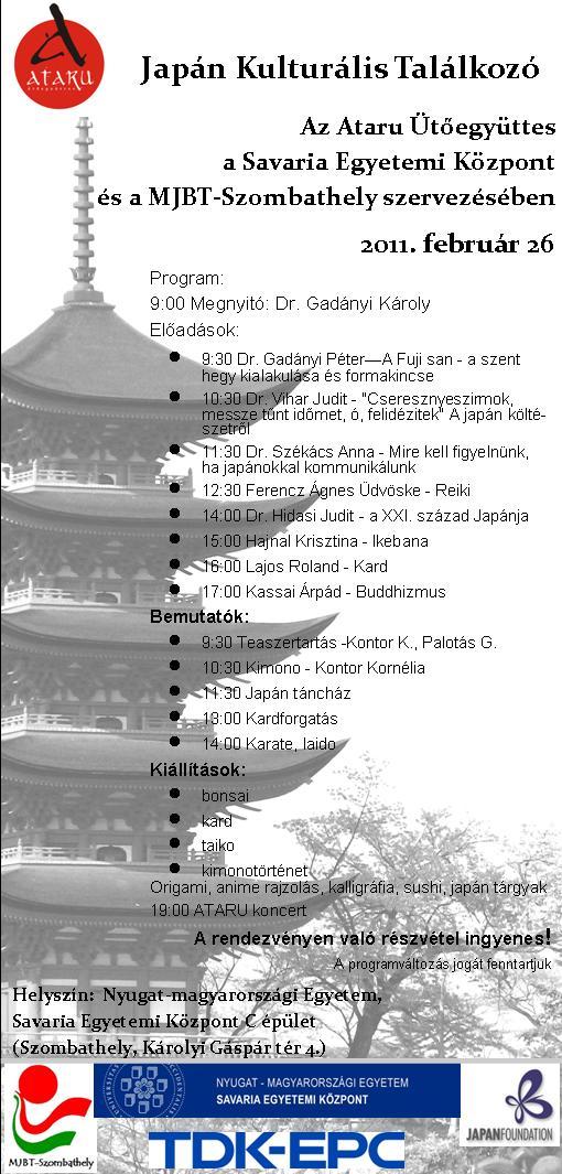 Az Ataru Taiko Ütőegyüttes, a Savaria Egyetemi Központ, és a MJBT- Szombathely szervezésében létrejött rendezvény február 26.-án 9 órától 20 óráig várja az érdeklődőket. A résztvevők különböző témájú előadások, változatos bemutatók, és érdekes kiállítások által nyernek bepillantást a szigetország kultúrájába. Az egész napos találkozót az Ataru Taiko Ütőegyüttes koncertje zárja. Az ingyenesen látogatható rendezvényt Dr. Gadányi Károly elnök, rektorhelyettes nyitja meg.