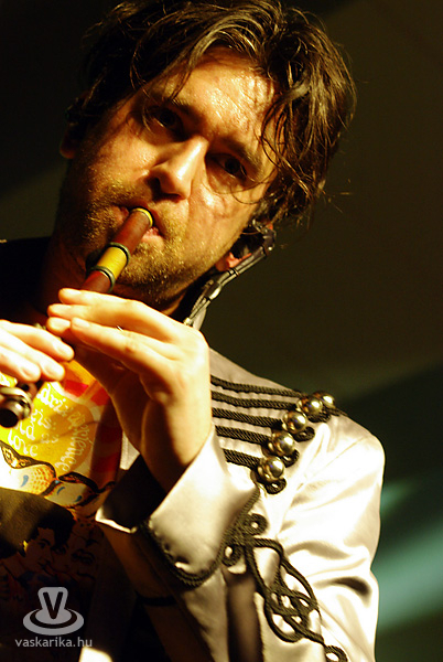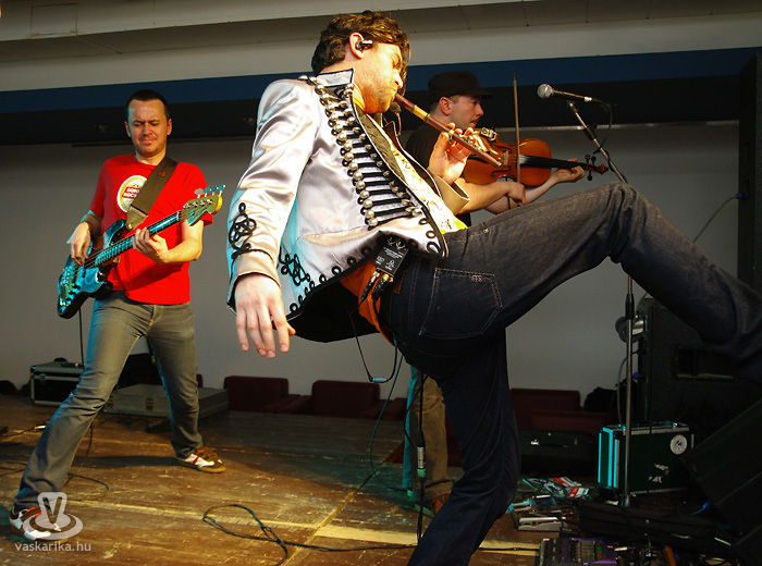 Nem először jár Szombathelyen a Kerekes Band. Aki egy kicsit is utánaserlokholmészkodott, annak nem újdonság, hogy az „egri betyárok" felléptek már a Savaria Karnevál Fórum Színpadán és a Márton napi vásáron is. Fehér Zsomborék fúziós etnója - vagy nevezzük világzenének, crossovernek, „furulyafunknak" stb - mindenképp a honi zenei paletta ínyence, egy fülre és lábra ható „népzenei Negró". Fenti hasonlat legalább annyira pimasz, mint amennyire zeneileg a hasonló címet viselő debütalbum (Pimasz) volt, melyről a mentés frontember bandája „Sticában" le is nyomta a Csángó Boogiet, a Medinát és ráadásként a Pimaszt. A második, Fel a kalappal albumról beazonosítottuk az Ethno Funkot, a 14 Pengőt, a Pop Szegecset, bár ebben a zenei utazásban nem is a felcsendülő számok felismerése, sokkal inkább szilaj táncra hívása volt hangsúlyos. Ez pedig maradéktalanul teljesült, még egy kisebb litván kolónia is áradozott a zene nagyszerűségéről, s végigpörögte az erős másfél órát. Aki pedig tamáskodva fogadná, hogy - effektelt - furulyával nem lehet plafonigugrós hangulatot varázsolni, az sürgősen szerezze be a zenekar hordozóit! (BLH)