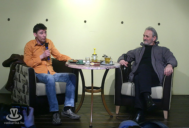 Nem csupán a SzínházSzerda előtt, hanem utána is várta a két színészt a nagyszínpad: este hétkor újra felgördült a Tragédia függönye. A nagy hajtás közepette minden bizonnyal a művészeknek is szükségük volt arra az egy óra kikapcsolódásra, ami a két előadás között jutott nekik arra a napra, ezért azt hiszem, bocsánatos bűn, hogy nem a szokásos kérdésekre koncentrálódott a beszélgetés. A két férfi közös élményeit elevenítette fel a közönség előtt, többek közt az első találkozás emlékét. Trokán Péter jól emlékszik az első pohár borra, melynek kortyolgatása közben döbbent rá, hogy a gőzerővel pörgő kölyökképű srác, aki iszogatni invitálta, valójában a legújabb kollégája. Aztán egyre több kellemes meglepetés érte a fiatalember kapcsán: kiderült számára, hogy tehetséges színésszel, nagyszerű énekessel, sőt, egy valódi akrobatával bővült a társulat. Lassan kibontakozott Zoli sok-sok arca és hangja. Ez utóbbiból a Café Frei vendégei is ízelítőt kaphattak: megidézte nekünk többek között Máté Erzsit és Dolák-Saly Róbertet is.