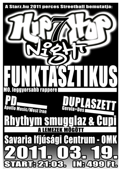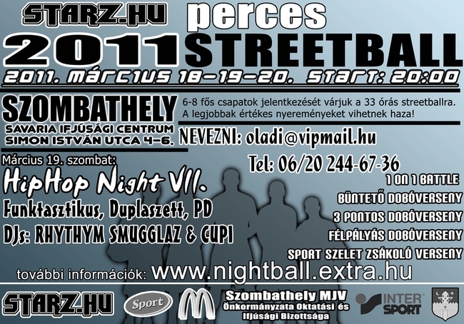 Március 19-én, szombaton kerül sor a Hip-Hop Night rendezvénysorozat immár hetedik rendezvényére a Savaria Ifjúsági Centrumban. A buli ezúttal a 2011 perces Nightball Bajnokság kísérő rendezvényeként kerül megrendezésre.