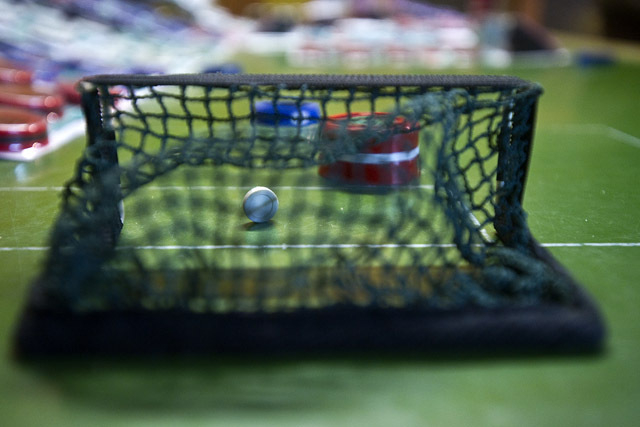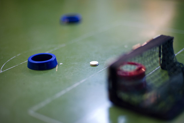 - A játékot két ember játssza egy zöld színű, fehér színű futballpálya vonalazású, 120 x 180 cm-es méretű, szegéllyel ellátott asztalon (versenypályán), amely két db 5 cm magas, 13 cm széles és 8 cm mély kapuval van ellátva. A pálya felületét hintőporos törlőeszközzel tisztítják meg a szennyeződésektől.