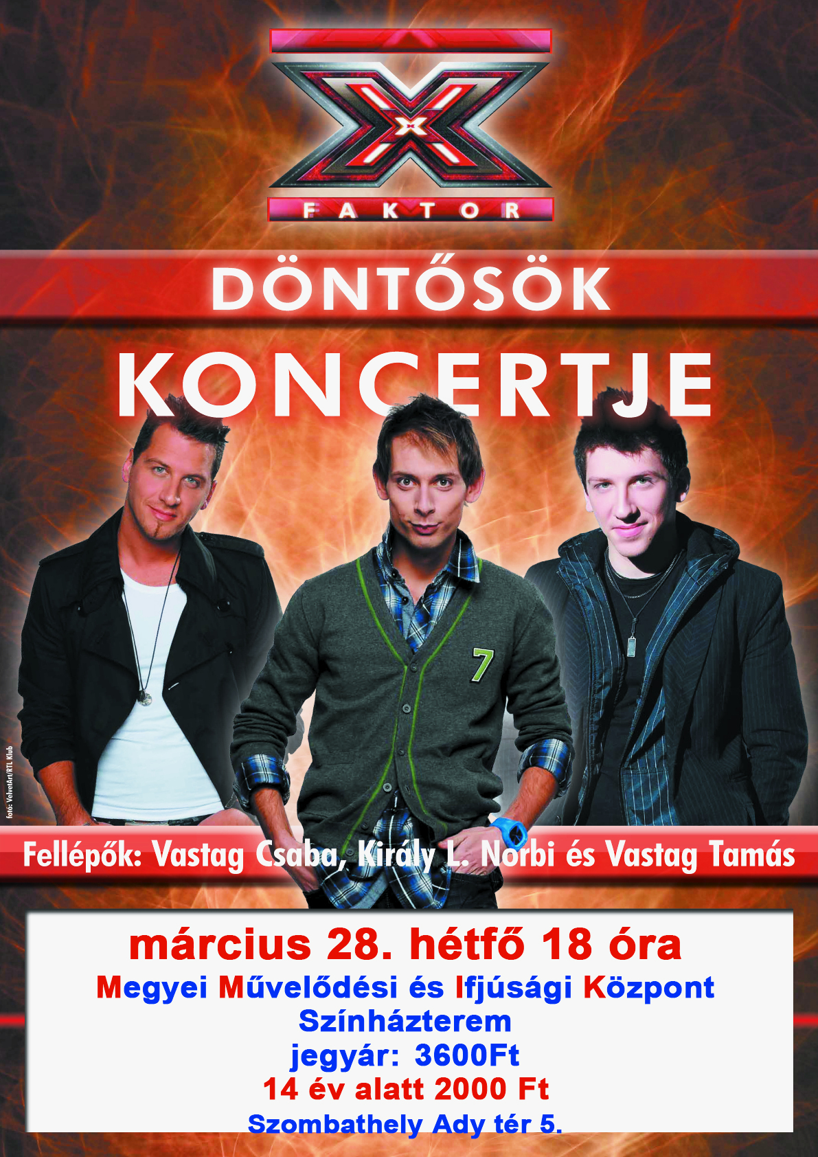 Március 28.-án, hétfőn az MMIK-ban lépnek fel az X-faktor tehetségkutató döntősei, azaz Vastag Csaba, Vastag Tamás és Király L. Norbert. A nyereményjátékunkra helyes választ beküldők között 2 darab belépőt sorsolunk ki! Március 26.-ig várjuk olvasóink megfejtését!