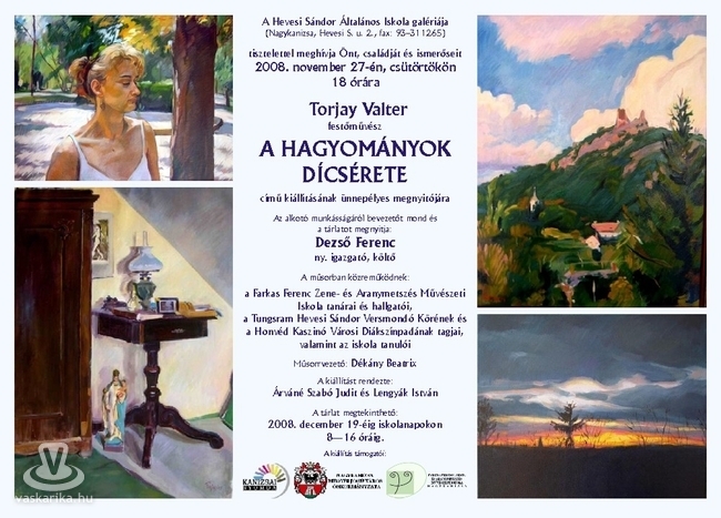2008. november 27-én (csütörtök) 18 órakor nyílik a nagykanizsai Hevesi Sándor Általános Iskola (Nagykanizsa, Hevesi u. 2.) galériájában Torjay Valter szombathelyi szimbolista festő tárlata.