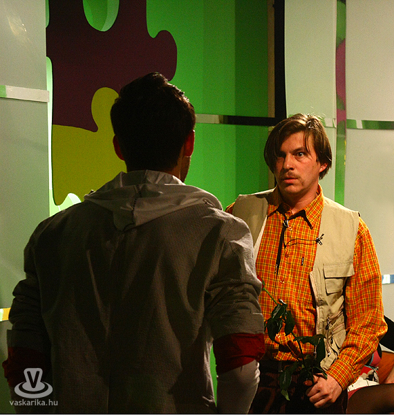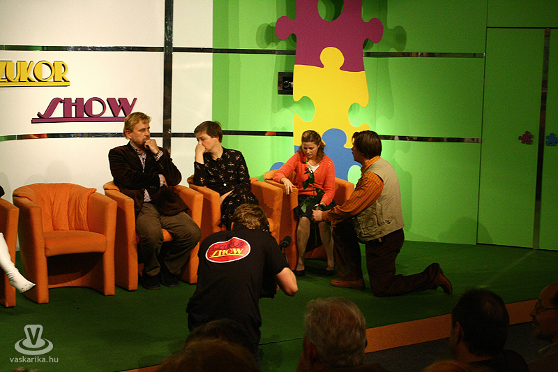 A show-vivő (Czukor Balázs), próbálja úgy szőni a beszélgetés fonalát, hogy közben kibomlik minden szereplő karaktere, személyisége: Erzsébeté (Péter Kata), az édesanyja ápolása miatt évek óta unalmas és egyhangú életet élő, de harsány öltözékével ebből kitörni kívánó nőé, Nóraé (Vasvári Emese), a határozott, eseményeket irányítani próbáló, mégis szürkén a háttérbe húzódó feleségé, aki nem is akar itt lenni, és szeretne kimaradni ebből az egész „showból". Testét a színpadtól befelé fordítja, nem néz a műsorvezető szemébe, tőmondatokba válaszol, és általában a tenyere közé rejti arcát. Mint később kiderül, már-már betegesen akarja maga mellett tartani cseppet sem szimpatikus férjét. Inkább elviseli, hogy megcsalják, megalázzák, csak ne kelljen egyedül lennie. Remekül megformált karakter Imre Béláé (Szabados Mihály), az esetlen mondatokat fabrikáló ("leszögezem a hölgyet mellettem, hogy nem ismerem") hős-szerelmes rózsa- és lakástulajdonosé, Gyuláé (Anger Zsolt), a szoknyabolond, alkoholista anyját elhanyagoló nyomdászé és Mónikáé (Csonka Szilvia), az "épphogyfelnőtt" gyereklányé, aki az események kilátástalan alakulása miatt öngyilkosságba menekül a darab végén.