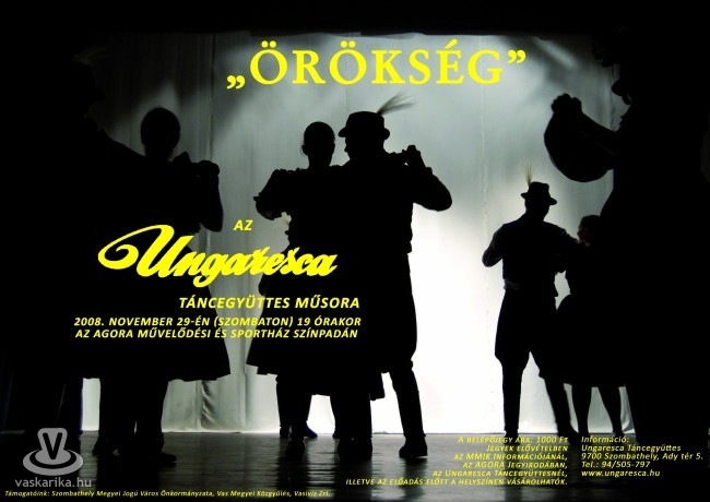 Az Ungaresca Táncegyüttes "Örökség" c. műsora lesz megtekinthető 2008. november 29-én (szombaton) 19 órakor az AGORA Művelődési és Sportház színpadán.