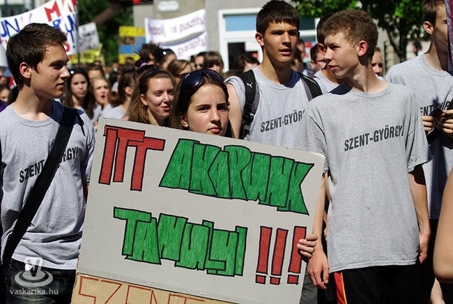 Jómagam is Szent-Györgyis voltam - tehát elmondhatjuk, antihősök is kerültek ki onnan jelentős mennyiségben -, s bár azt elértem, hogy a magam süket véleményét hangoztathatom itt időnként, jól tudom, az ott szerzett tapasztalatokat sokkal jobban is lehetett volna kamatoztatni. Szerettük a sulit, dacára annak, hogy néha nagyon is melléjártunk. Néha kocsmáztunk helyette, néha csak a nulladik, vagy az első órát hagytuk ki, de a szüneteket becsülettel végigbagóztuk a fiúklotyóban, és a legmélyebb tisztelettel jártunk egy-egy tanerő idegein kötéltáncot. Azonban, ha közösségi feladatról volt szó, megmérettetésről, bemutatkozási alkalomról, vagy a legkisebb exhibicionizmust igénylő eseményről, mindig ment bele apai-anyai. Meg is mondtuk volna: „Akkor zárass be, ha ezt utánunk csinálod - vagy ha bárki más megteszi!" Ha a tanulmányi átlagunk nem is, a műsoraink színvonala mindig kimagasló volt. Ha a mi időnkben történt volna ilyesmi (1996/2000), ez a demonstráció korántsem ilyen hangnemet ütött volna meg. Ahogy én emlékszem erre az iskolára, a kreativitás nem állt meg verseknél és daloknál, csöpögős múltidézésnél - persze lett volna abból is bőven -, hanem az utcára vittük volna, mit is csinálunk. Emlékszem, ha kellett, egy nap alatt forgattunk filmet, rekordidő alatt gyakoroltunk be színdarabokat, vagy zenéltünk teljesen saját kútfőből, helyzetgyakorlatokat játszottunk már akkor, mikor még a „Beugró" mint műsorötlet sem létezett, de volt ambu-babánk is, amivel rettenetes nagyokat ökörködtünk, mikor épp nem az eü-bemutatóhoz kellett. Ezeket összegyúrva tettük volna ki a kirakatba. Persze az is igaz, hogy egy tüntetésnek nem ez a célja, hanem megmutatni, hogy nem hagyjuk magunkat. Megvédeni a helyet, az intézményt, ahol sokak életének legmeghatározóbb szakasza zajlott, és zajlik most is.