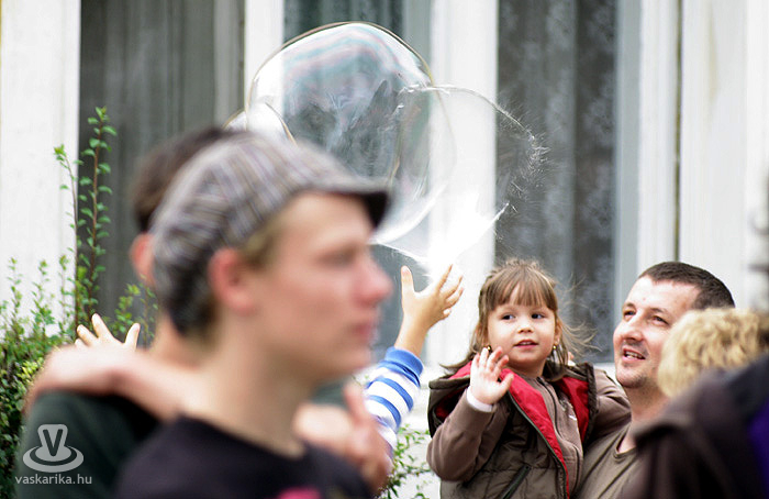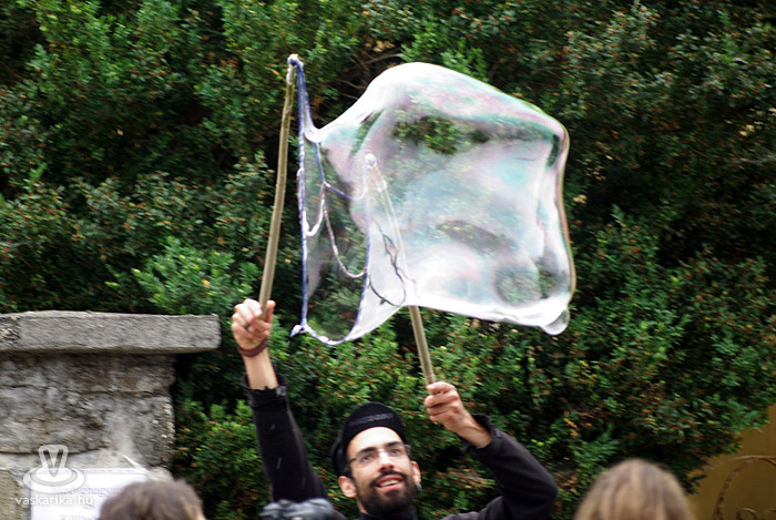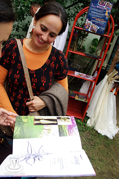 Remek koncerthelyszín az Alexandra Könyvudvar, ahol tegnap a Paganza és Bognár Szilvi lépett fel. Utóbbival összefutottunk a Manókertben, amit semmiképp nem érdemes kihagyni a zöldbe applikált, szerethető kerámiafigurák, valamint a képzőművészek csodás produktumai miatt sem. Nem akarunk kiemelni egy alkotót sem a Malomsziget kiállítói közül, ám Toll Tünde gyapjúképei, és a már említett manók igazi mesebeli hellyé varázsolják az amúgyis szívcsücsök szigetet. Itt lépnek fel Snétberger Ferenc tehetségközpontjának ifjú növendékei, akik a cigányzene virtuóz dallamival ízesítik a kenyérlángosos - pecsenyesütős ínycsiklandozást.