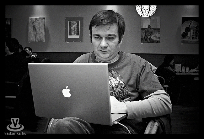 Az első három kép a Cafe Freiben készült, még márciusban. Egy kisebb baráti társasággal minden csütörtök este összejöttünk ott. Gabi nem tartozott a csütörtöki csapathoz, de mindenkit ismert, mindenkivel jóban volt. Egy alkalommal ő is ott ült velünk, természetesen a nélkülözhetetlen macbookjával. Netezgetett, dumáltunk, ha kellett, beszólt - talán a fotózgatásért is... Szerettem volna, ha gyakrabban jön közénk, szeretném, ha most is beszólogatna.