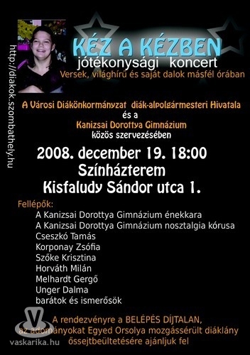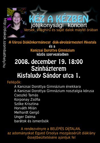 Kéz a Kézben címmel rendez jótékonysági koncertet a Városi Diákönkormányzat Diák-alpolgármesteri Hivatala a Kanizsai Dorottya Gimnáziummal karöltve. 2008. december 19-én, este 18 órakor.