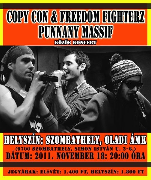 November 18-án, pénteken a Savaria Ifjúsági Centrum színpadán ad közös koncertet hazánk két meghatározó hip-hop-reggae csapata, a Copy Con & Freedom Fighterz és a Punnany Massif. Copyék már rendszeres visszajáró vendégei a SIC-es buliknak, az idén MTV EMA díjra jelölt Punnany viszont most először teszi tiszteletét az oladi végeken, természetesen teljes, zenekari felállással. A koncertek előtt és után a hagyományokhoz híven DJ. Kicsi fokozza majd a hangulatot.