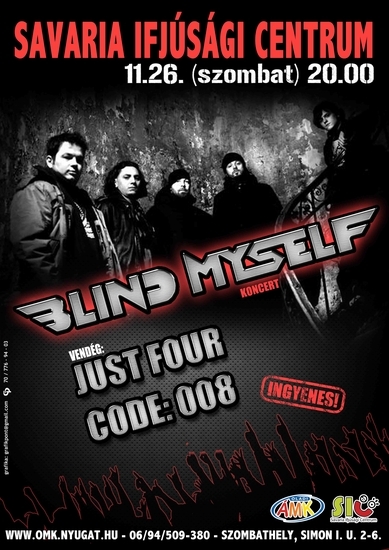 26-án, szombaton a hardcore-metal stílus szerelmesei hódolhatnak kedvenc zenéiknek. Érkezik a már több, mint 15 éve a színtér meghatározó zenekara, a jelentős külföldi sikereket is maga mögött tudó Blind Myself. A hangulat kellő mértékűre izzításáról a Just Four, és a Code: 008 gondoskodik. Kapunyitás szintén 8-kor, a belépés ingyenes!