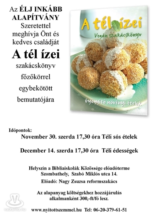A tél ízei című kiadvány egy elindított sorozat következő füzete. Az előadó felkészült tájékoztató programján túl ismét kóstolhatjuk ezen délutánokon a finom és kikísérletezett eledeleket, amiket maga, a reformszakács készít el az érdeklődő megjelenteknek: nemcsak bemutatásra, hanem elfogyasztásra is. A háromszáz forintos beugróval járulunk hozzá a költségekhez...