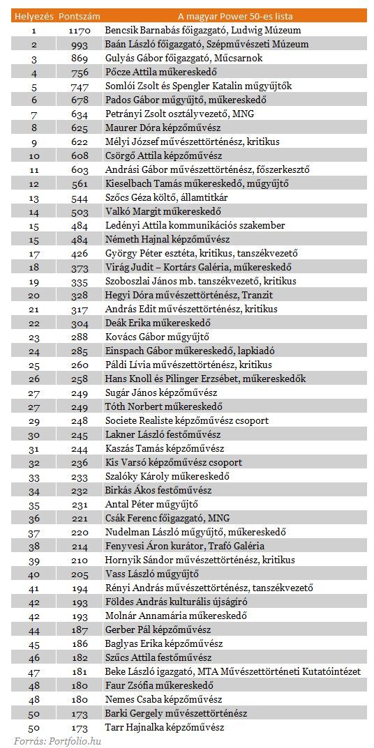 A Műértő művészeti és műkereskedelmi folyóirat első ízben állította össze a Magyar Power 50-et, a hazai művészeti színtér ötven legbefolyásosabb szereplőjének listáját. A rangsor az ArtReview című tekintélyes nemzetközi művészeti folyóirat Power 100-as listájának mintájára, jellemzően az ott bevált módszert követve készült. A zsűrit 25 neves, a Műértő szerkesztősége által felkért, a hazai képzőművészet és a műkereskedelem világát belülről ismerő szakember alkotta. A Magyar Power 50-et a Műértő december 1-jén a Ludwig Múzeumban tartott rendezvény keretében mutatta be: