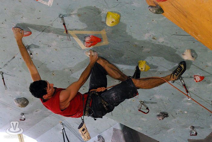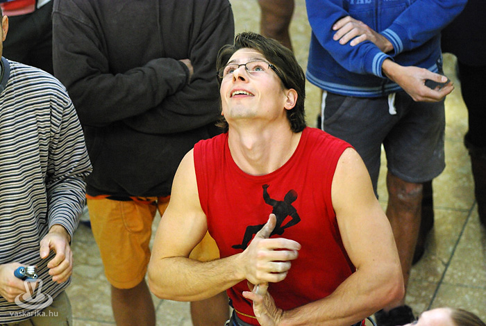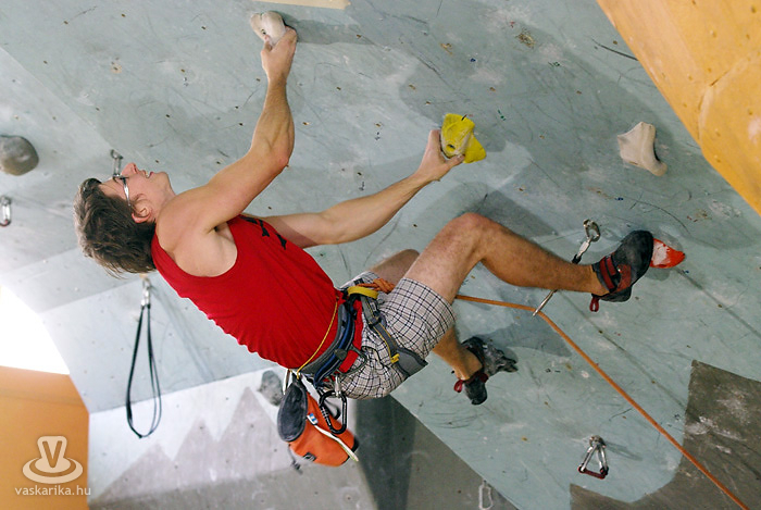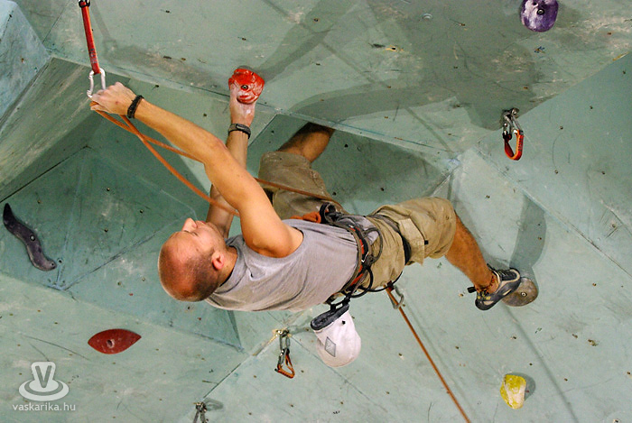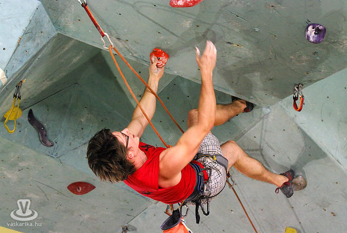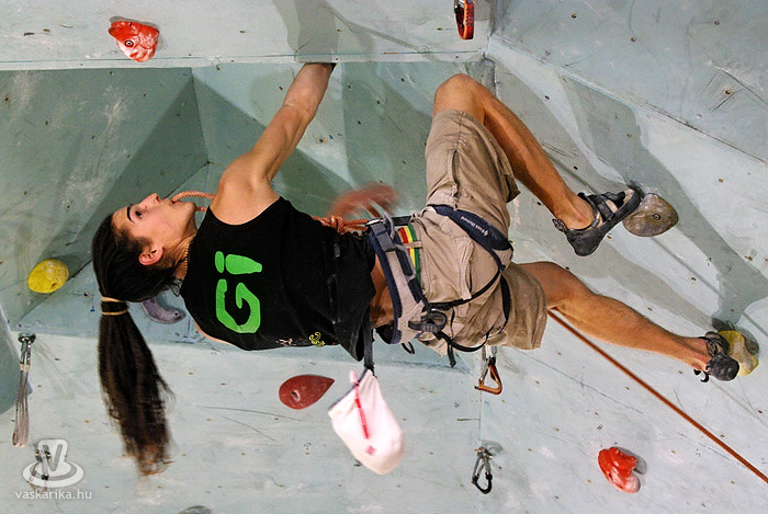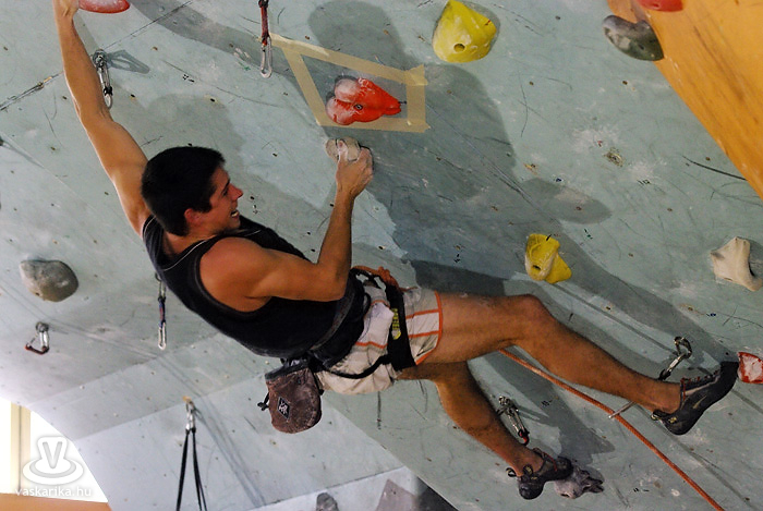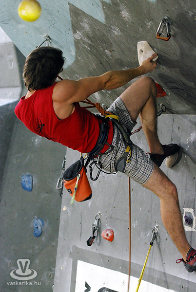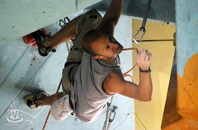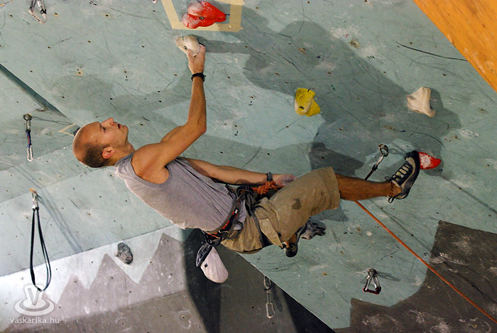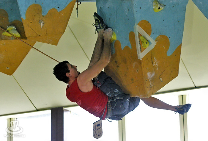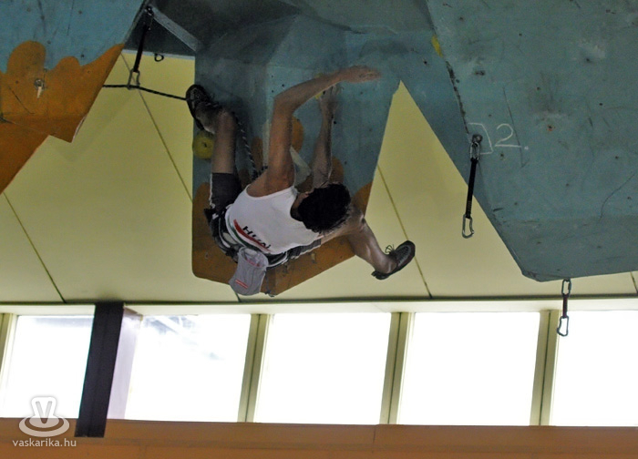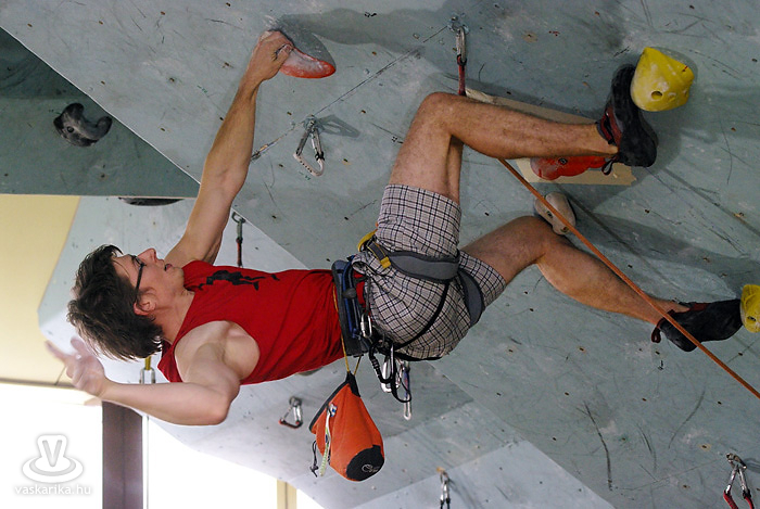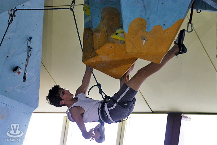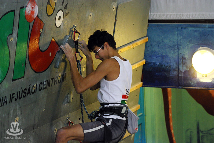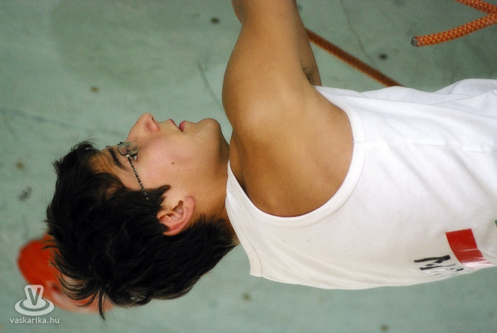 A kisfiú, a veszprémi edző fia, aki négyéves kora óta mászik. Egyébként ő már nem is annyira kisfiú, hiszen tizenhárom éves, de versenyen kívül kell másznia, mert csak tizennégy év felettiek indulhattak nyílt kategóriában. A legfiatalabb versenyző nálunk például egy hétéves kislány.